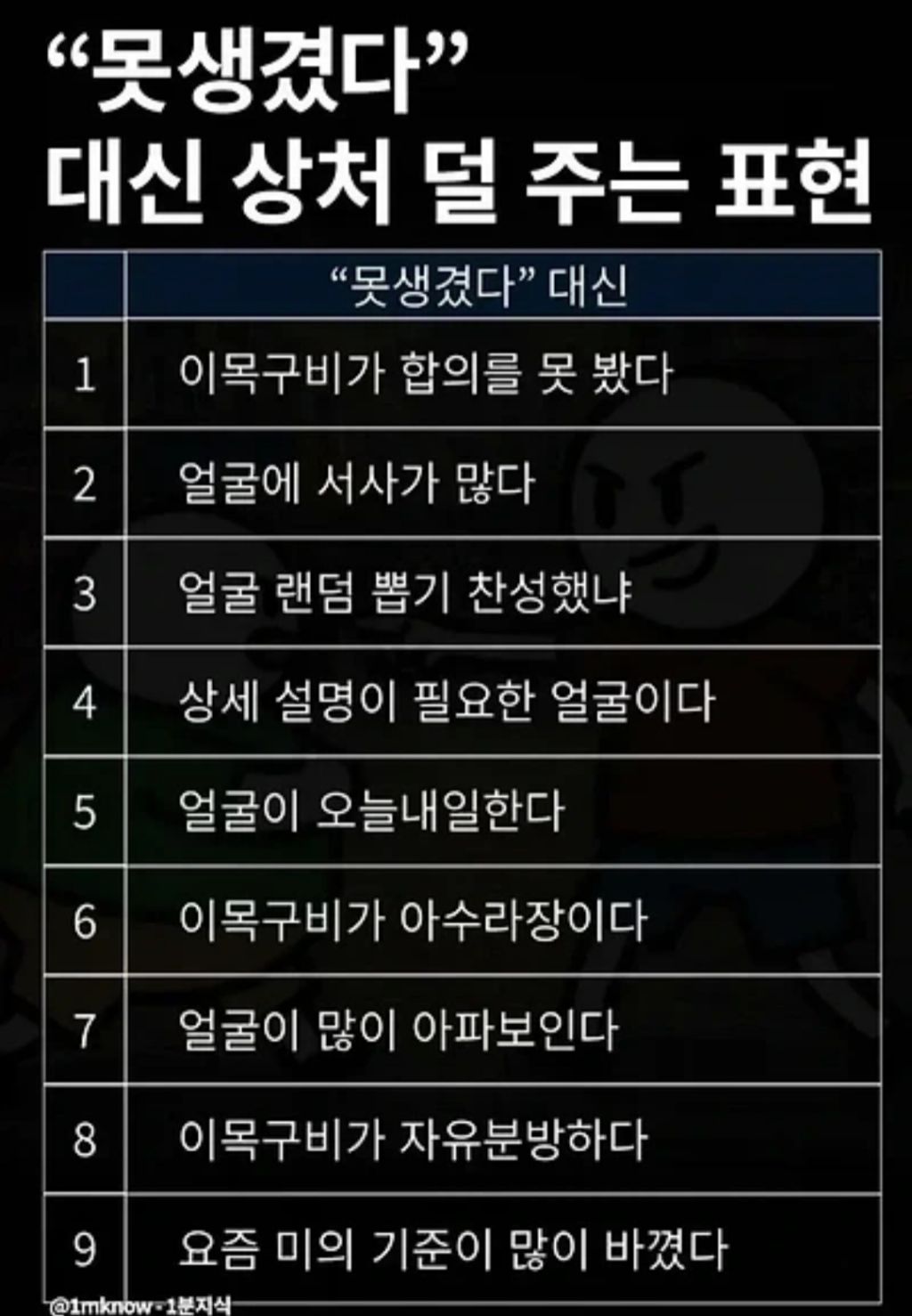 [기타]"못생겼다" 대신 상처 덜 주는 표현 작성자음교수|작성시간26.01.23|조회수3,387 목록 댓글 16 글자크기 작게가 글자크기 크게가 다음검색 현재 게시글 추가 기능 열기 북마크 공유하기 신고 센터로 신고 댓글 댓글 16 댓글쓰기 답글쓰기 댓글 리스트 작성자한번더 나에게 질풍같은 용기를 | 작성시간 26.01.23 걍 대놓고 못생겼다고 해라 작성자귄터 슈타이너 | 작성시간 26.01.23 섭섭하다라는 표현도 있음 작성자흥민재 | 작성시간 26.01.23 ㅋㅋㅋㅋㅋㅋㅋㅋㅋㅋㅋㅋㅋㅋ 작성자Pringles | 작성시간 26.01.23 ㅋㅋㅋㅋㅋㅋㅋㅋㅋㅋㅋ 작성자I.B.I LUV | 작성시간 26.01.23 이게 더 타격 크다고 ㅋㅋㅋㅋㅋㅋㅋㅋㅋㅋㅋ 댓글 전체보기