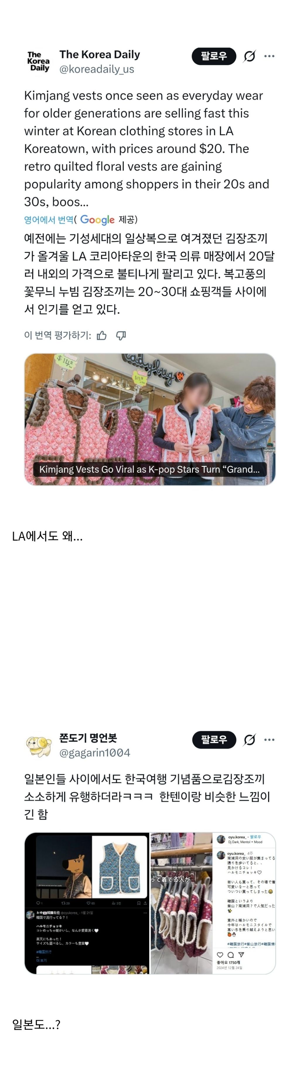 [유머]요즘 해외에서 유행한다는 김장조끼.jpg 작성자강동구주민 3|작성시간26.01.23|조회수5,201 목록 댓글 7 글자크기 작게가 글자크기 크게가 다음검색 현재 게시글 추가 기능 열기 북마크 공유하기 신고 센터로 신고 댓글 댓글 7 댓글쓰기 답글쓰기 댓글 리스트 작성자령채 | 작성시간 26.01.23 도대체 무슨일이 벌어지는 거지 작성자EvolUtIon | 작성시간 26.01.23 근데 엄청 따듯함 ㅋㅋㅋ 한번씩들 입어보세요 보온성 최고 작성자에라스네츠 | 작성시간 26.01.23 아니 왜??? 작성자인쿠시 | 작성시간 26.01.24 저거 지나가면서 보면 되게 색감 이쁨 ㅋㅋㅋㅋ 작성자이유비 | 작성시간 26.01.24 울집 애들도 잘입음 애들용도 있어서 ㅎㅋ 댓글 전체보기