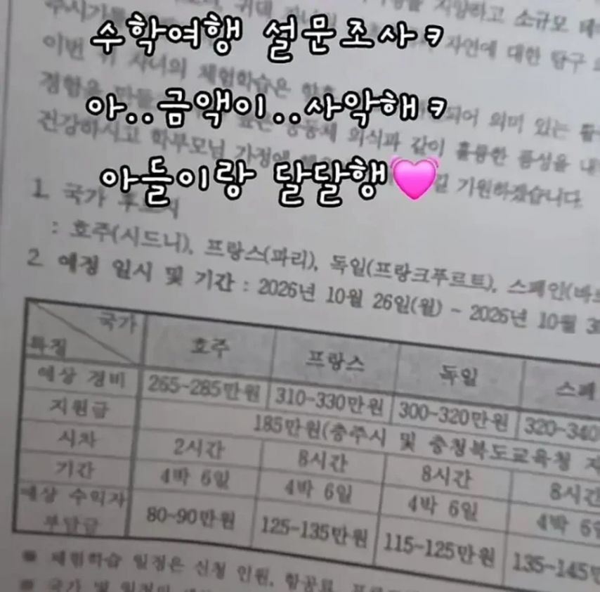 답댓글 작성자ManchesterUnited 작성시간 26.01.24 6학년의 경우 수학여행 지원금으로 학교에서 학생당 24만원 정도 의무 책정하게 되어있고, 교육경비라고 학교 교육과정 운영하는데 지자체에서 보조해주는 것이 있습니다. 그렇다고 봐도 150~185만원 지원금은 어떻게 하면 나오는지 잘 모르겠네요^^;;