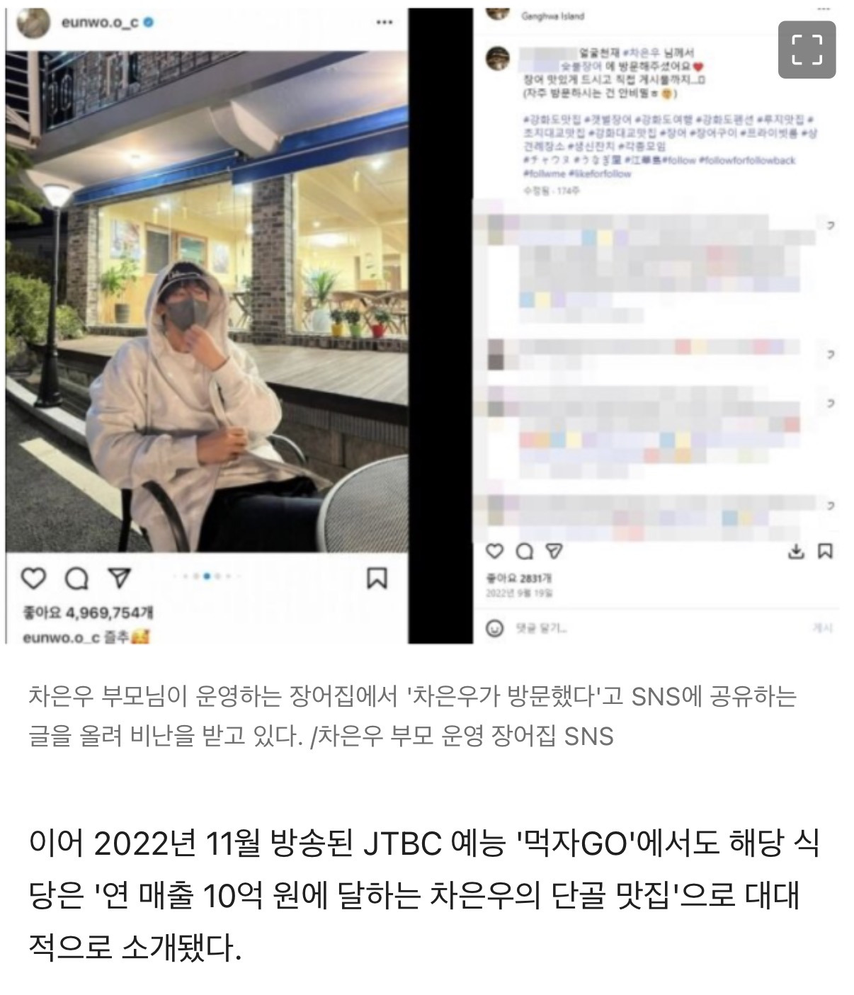 [기사]차은우, 부모 장어집을 '단골 맛집'으로 속임수 방송…시청자·팬 기만 작성자CokeR|작성시간26.01.25|조회수15,271 목록 댓글 16 글자크기 작게가 글자크기 크게가 https://v.daum.net/v/20260124074503109 다음검색 현재 게시글 추가 기능 열기 북마크 공유하기 신고 센터로 신고 댓글 댓글 16 댓글쓰기 답글쓰기 댓글 리스트 작성자William SALIBA | 작성시간 26.01.25 어휴 작성자정예린 | 작성시간 26.01.25 ㄷㄷㄷ 작성자김경수도지사 | 작성시간 26.01.25 …; 작성자밀키스 | 작성시간 26.01.25 헐 ㄷㄷ 작성자서초패왕 항우 | 작성시간 26.01.25 이야 ㅋㅋㅋㅋㅋㅋㅋㅋㅋㅋ 댓글 전체보기