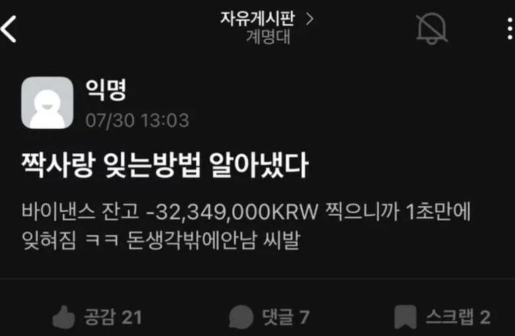 樂soccer 짝사랑 잊는 법 알아냈다 작성시간26.01.25|조회수9,128 목록 댓글 3 글자크기 작게가 글자크기 크게가 다음검색 현재 게시글 추가 기능 열기 북마크 공유하기 신고 센터로 신고 댓글 3 댓글 리스트 작성시간 26.01.25 ㅠㅠ 작성시간 26.01.25 짝사랑만 잃어야지 돈도 잃으면 어뜩함 ㅠ 작성시간 26.01.25 그냥 연예인 학폭 가해자처럼 생각하니까 그냥 저절로 잊혀지던데.... 생각보다 단순한 듯요 카페 방문해 더 많은 댓글 만나기!