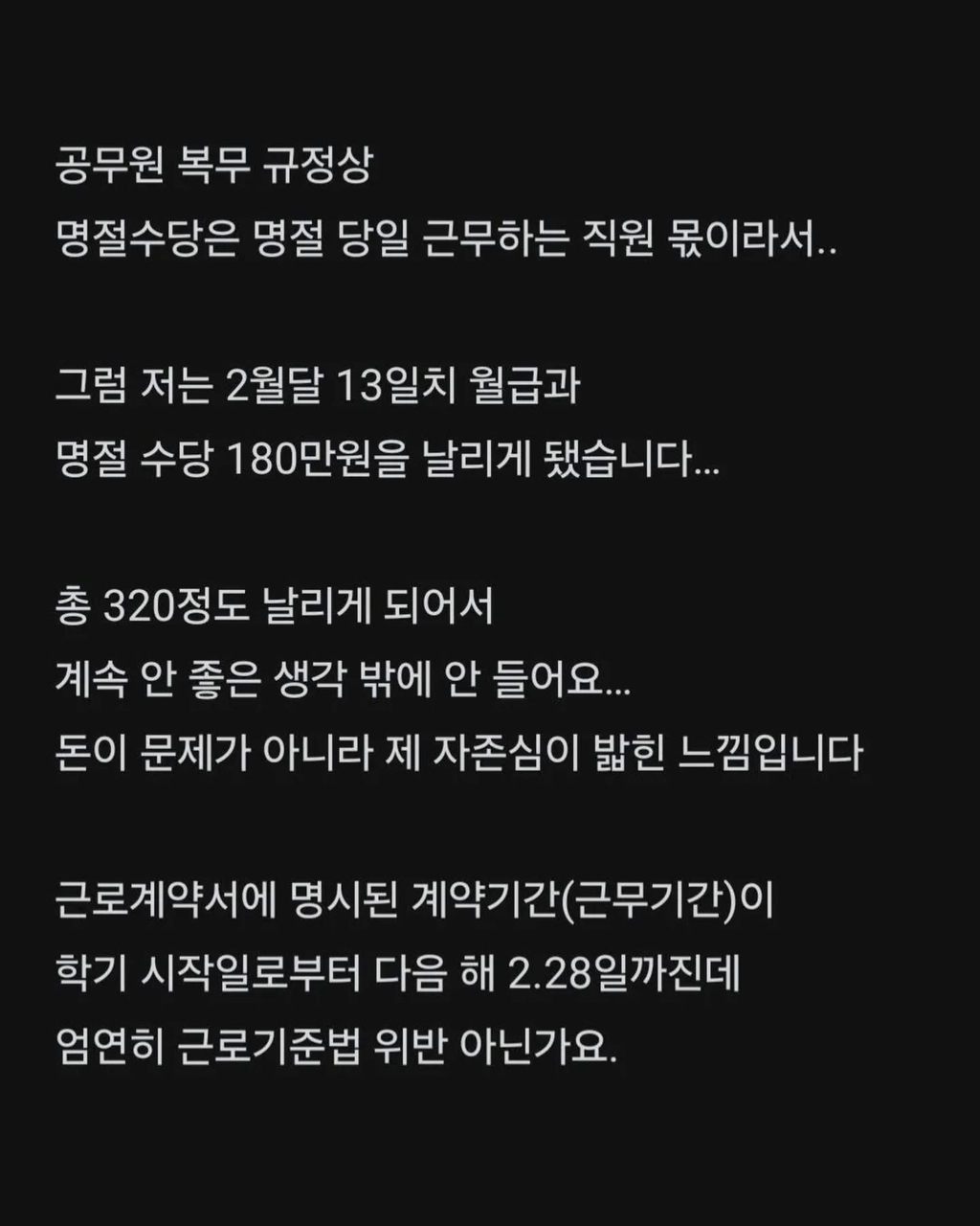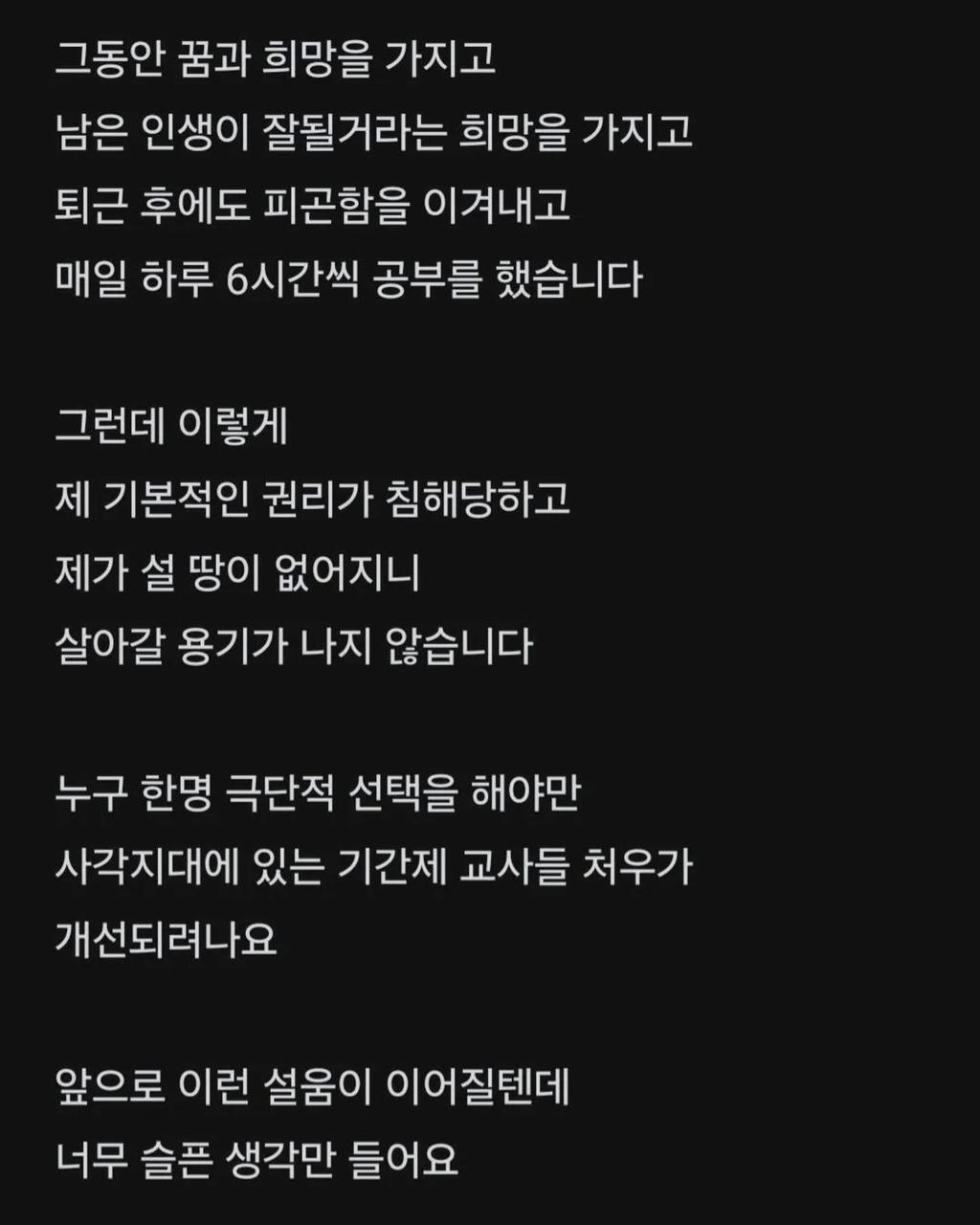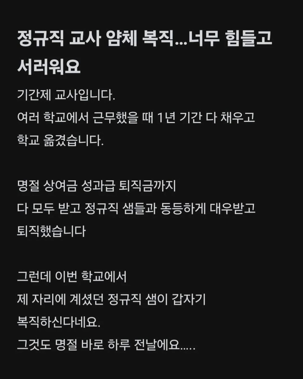 그리고 기간제교사 계약서에는 일단 끝나는 날짜가 명시되어 있지만, 복직자가 생기는 경우 복무기간을 보장하지 않는다는 문구가 들어가기 마련임. -