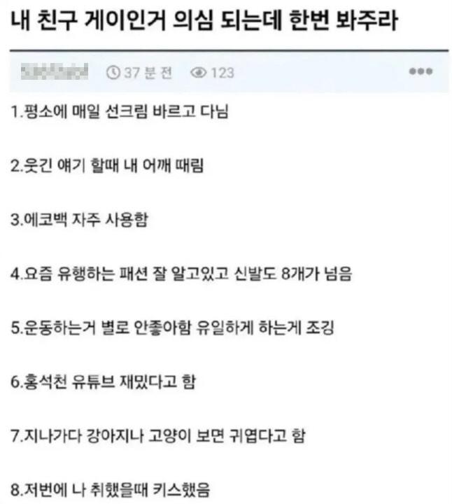 내 친구 게이인거 의심 되는데 한번 봐주라 작성자하얀마음흑구|작성시간26.01.25|조회수11,457 목록 댓글 13 글자크기 작게가 글자크기 크게가 다음검색 현재 게시글 추가 기능 열기 북마크 공유하기 신고 센터로 신고 댓글 댓글 13 댓글쓰기 답글쓰기 댓글 리스트 작성자I’d rather be ashes than dust | 작성시간 26.01.25 답정너 작성자I.B.I LUV | 작성시간 26.01.25 8번에서 끝 ㅋㅋㅋㅋㅋㅋㅋ 작성자HAN소희GO윤정SHIN예은 | 작성시간 26.01.25 8번ㄷㄷㄷ 작성자산티아고베르나베우 | 작성시간 26.01.25 ㅋㅋㅋㅋ 7번까진 아무것도 아닌데 8번 ㅋㅋㅋㅋ 작성자미니언즈 | 작성시간 26.01.25 8번 ㅋㅋㅋㅋㅋㅋ 댓글 전체보기