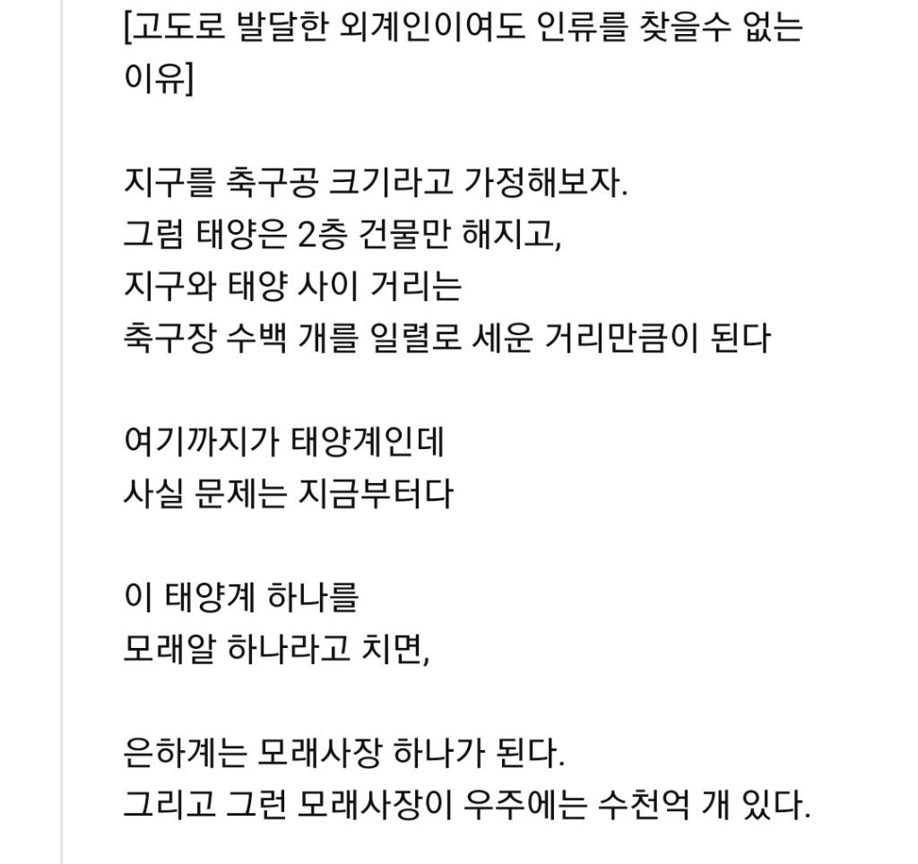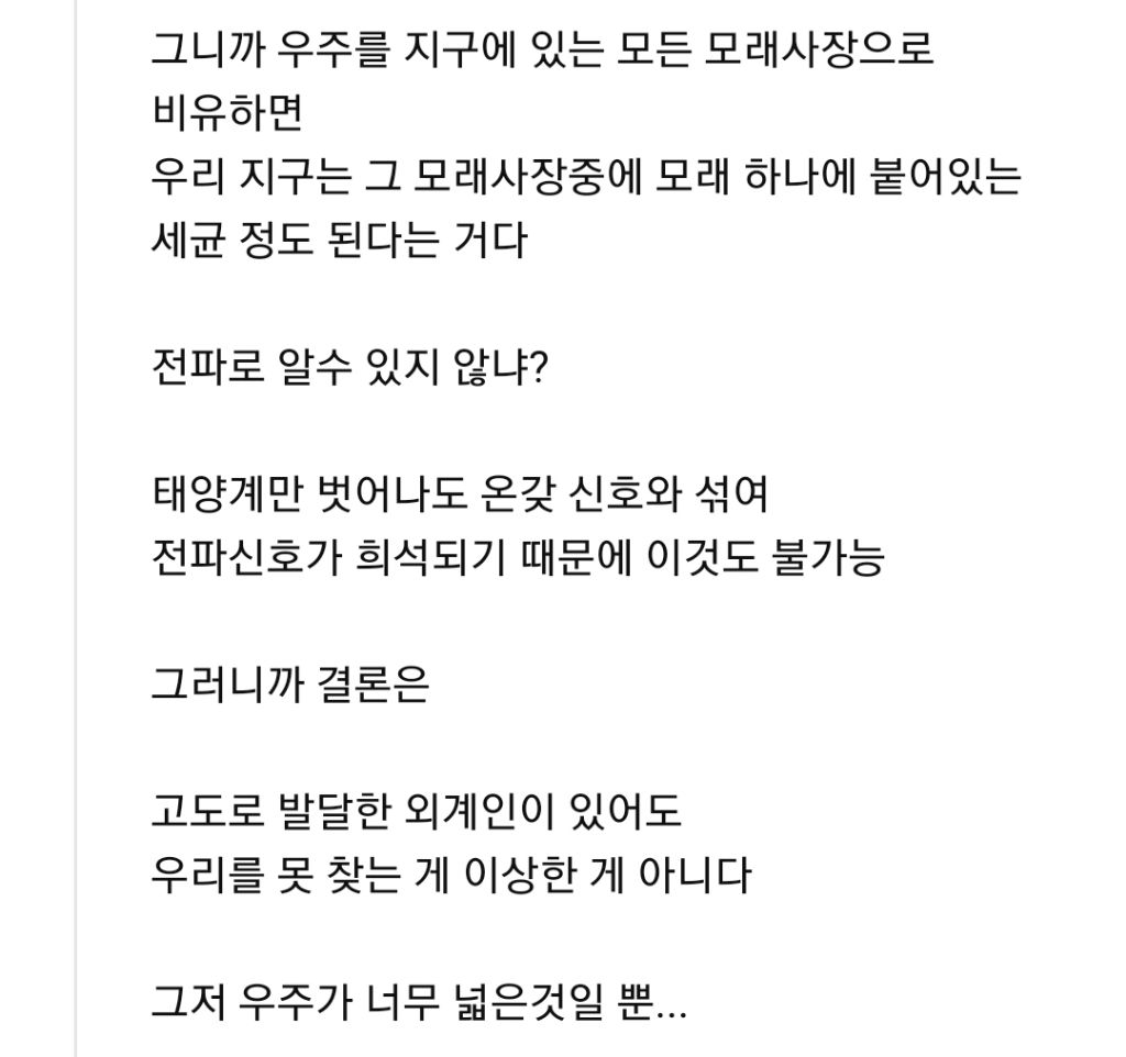인류를 멸망시킬 수 있는 외계인이 우리를 아직도 못찾은 이유 ㄷㄷ 작성자Tove Styrke|작성시간26.01.25|조회수2,441 목록 댓글 13 글자크기 작게가 글자크기 크게가 다음검색 현재 게시글 추가 기능 열기 북마크 공유하기 신고 센터로 신고 댓글 댓글 13 댓글쓰기 답글쓰기 댓글 리스트 작성자몽념, 낙화대 | 작성시간 26.01.25 외계생명체는 있을거 같음 엄청나게 발달된 작성자율이 | 작성시간 26.01.26 흥미로우면서도 두려움.. 작성자시릴라 | 작성시간 26.01.26 지구도 생명 자체는 매우 빠르게 생겼지만 세포에서 생물로 진화하는 과정이 훨씬 오래걸렸다고 하던데 작성자여름학회 | 작성시간 26.01.26 이미 지구에 와있어요 작성자하빵 | 작성시간 26.01.26 메시가 외계인임 그래서 축신인거 댓글 전체보기