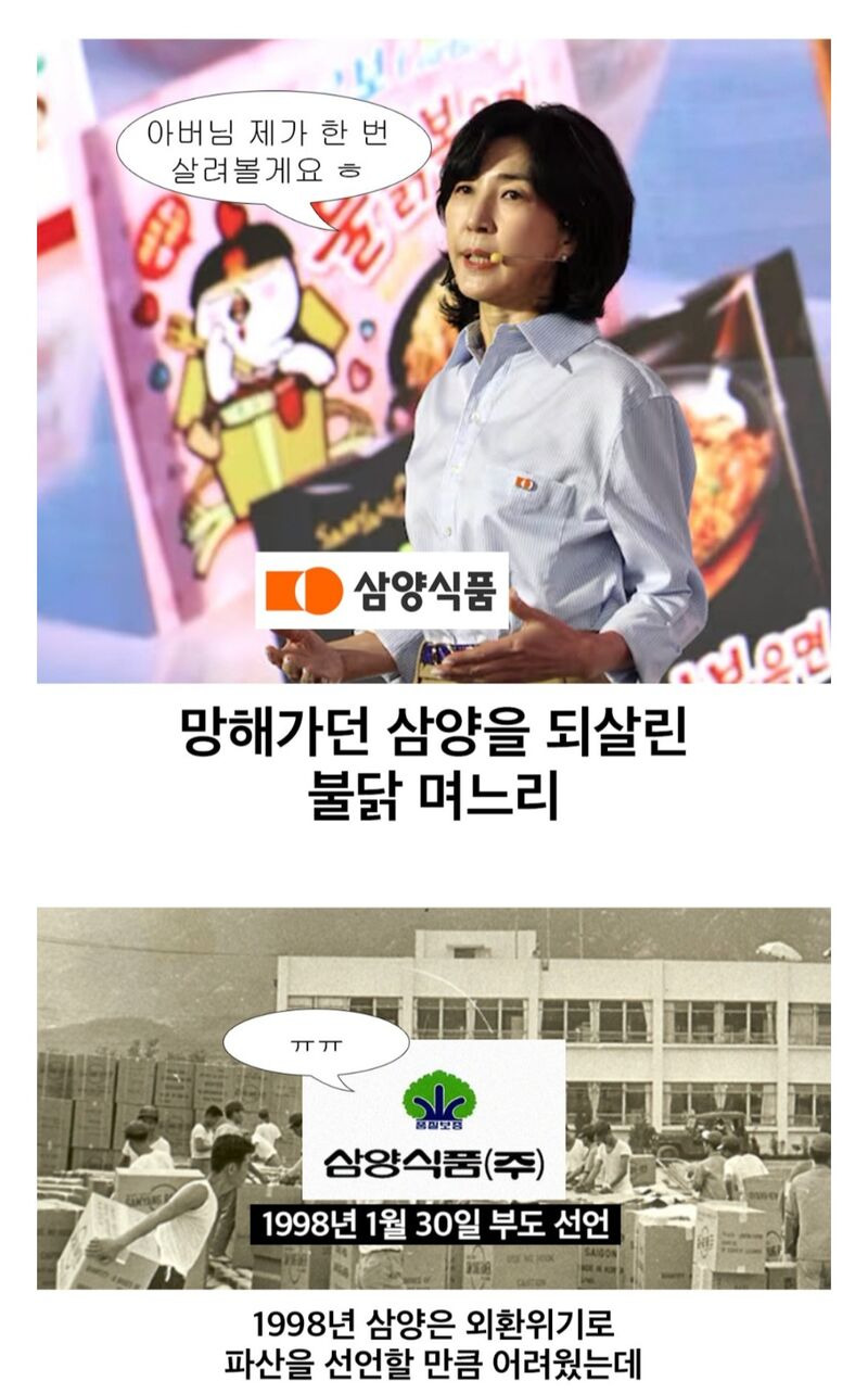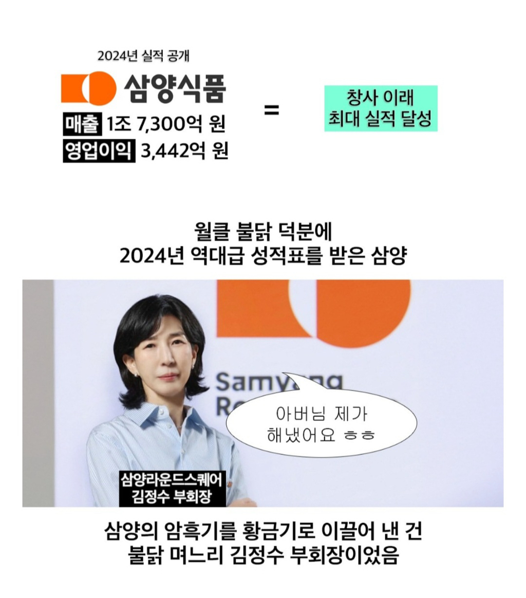 재벌집 불닭 며느리.jpg 작성자Google|작성시간26.01.26|조회수4,525 목록 댓글 2 글자크기 작게가 글자크기 크게가 현 삼양식품 대표 다음검색 현재 게시글 추가 기능 열기 북마크 공유하기 신고 센터로 신고 댓글 댓글 2 댓글쓰기 답글쓰기 댓글 리스트 작성자두부과자 | 작성시간 26.01.26 이분 밑에서 일해봤는데 소탈한 측면도 있음 다만 삼양식품에서 일해보면 진짜 개빡셈.. 답댓글 작성자미르페 | 작성시간 26.01.26 어떤기업이든 저정도 성공하려면 엄청 빡세긴 할꺼 같네요. 저는 저렇게 못살듯 댓글 전체보기