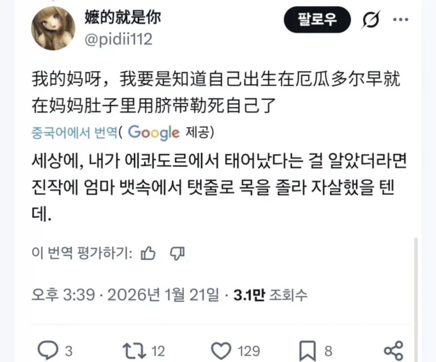 [기타]한중일을 또 합체시킨 에콰도르인.jpg 작성자강동구주민 3|작성시간26.01.26|조회수3,574 목록 댓글 30 글자크기 작게가 글자크기 크게가 다음검색 현재 게시글 추가 기능 열기 북마크 공유하기 신고 센터로 신고 댓글 댓글 30 댓글쓰기 답글쓰기 댓글 리스트 작성자디발라 | 작성시간 26.01.26 중국 ㄷㄷ 역시 제갈량의 후손들 작성자이게뭔일이람 | 작성시간 26.01.26 중국 드립 ㅋㅋㅋㅋㅋㅋㅋㅋㅋㅋㅋ 작성자레드자몽 | 작성시간 26.01.26 중국 미친ㅋㅋㅋㅋ 작성자파랑 | 작성시간 26.01.26 중국 개세닼ㅋㅋㅋㅋㅋㅋㅋㅋㅋㅋㅋㅋㅋㅋㅋㅋㅋㅋ 작성자고종현 | 작성시간 26.01.26 중국 존나 맵네 ㅋㅋㅋㅋㅋㅋㅋ 댓글 전체보기