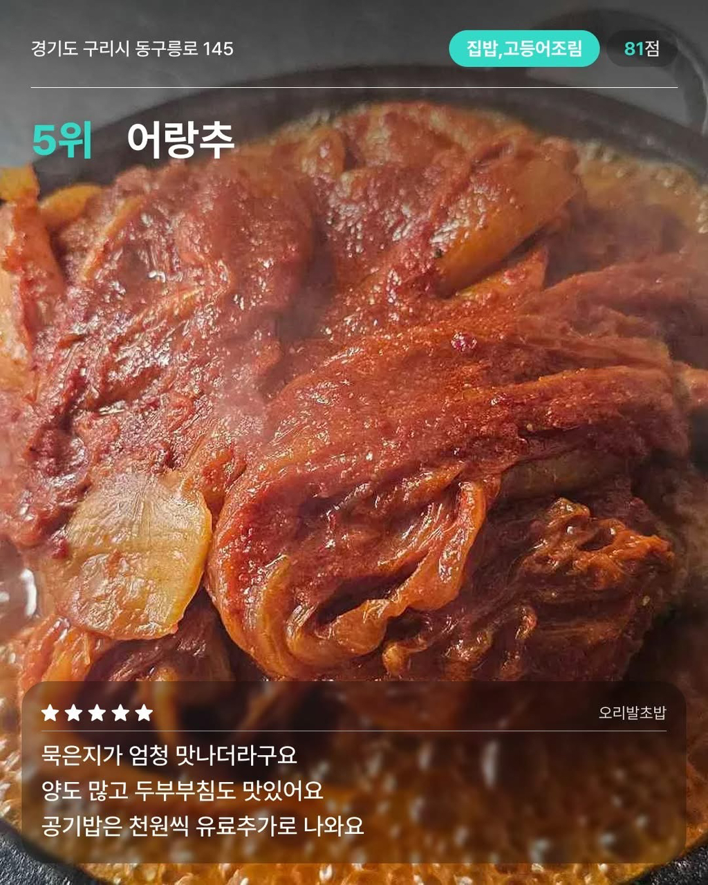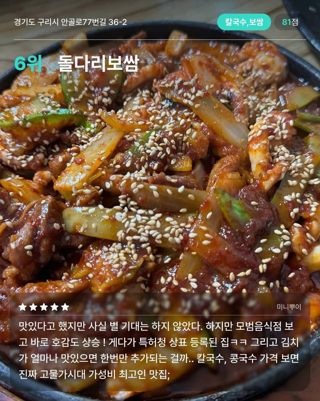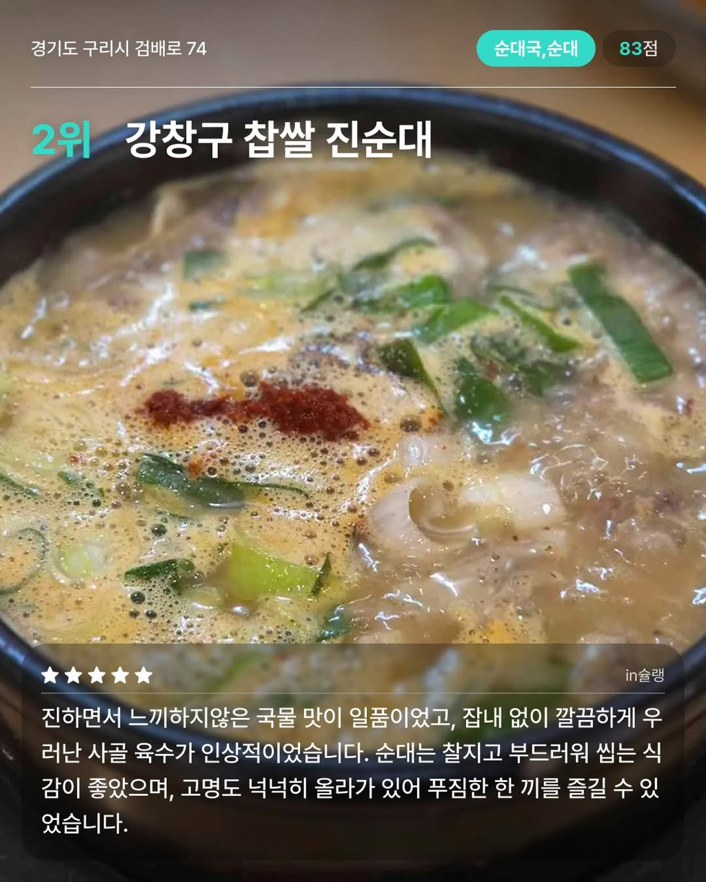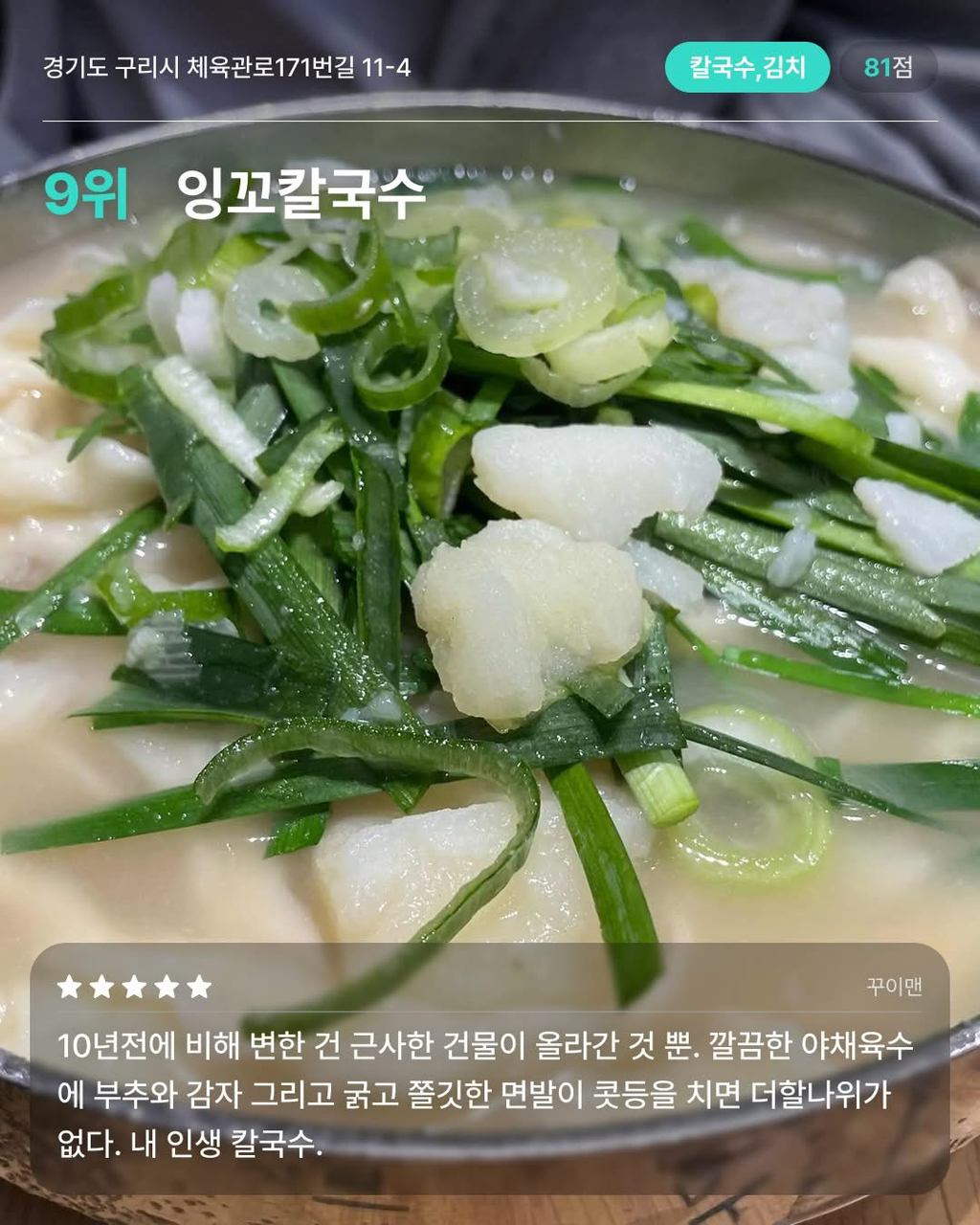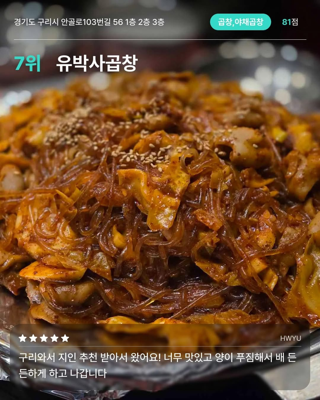 경기 구리 맛집 10 작성자가을날4|작성시간26.01.26|조회수8,230 목록 댓글 15 글자크기 작게가 글자크기 크게가 출처 다이닝코드 다음검색 현재 게시글 추가 기능 열기 북마크 공유하기 신고 센터로 신고 댓글 댓글 15 댓글쓰기 답글쓰기 댓글 리스트 작성자흐어엉어어 | 작성시간 26.01.26 ㄷㄱ 작성자Daniel Agger | 작성시간 26.01.26 미성식당 보배곱창 작성자워뇽이lㆆ lY운lㆆ눞옾 | 작성시간 26.01.26 곱창골목에서 유일하게 먹는 유박사..ㅎㅎ 작성자S-WORKS | 작성시간 26.01.26 구리 맛집 작성자Jordan Henderson | 작성시간 26.01.26 구리맛집 댓글 전체보기