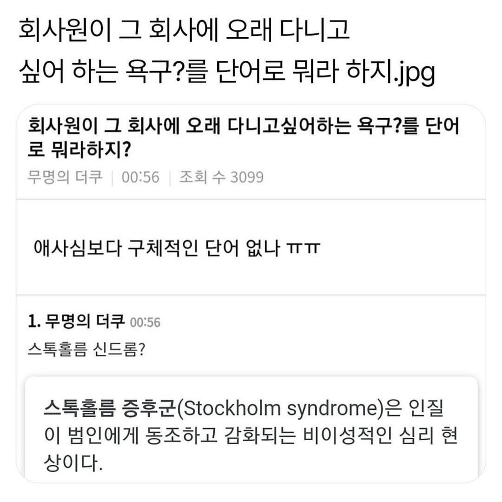 회사원이 그 회사에 오래 다니고 싶어하는 욕구를 뭐라하지? 작성자가을날4|작성시간26.01.26|조회수11,814 목록 댓글 6 글자크기 작게가 글자크기 크게가 다음검색 현재 게시글 추가 기능 열기 북마크 공유하기 신고 센터로 신고 댓글 댓글 6 댓글쓰기 답글쓰기 댓글 리스트 작성자호날도인 | 작성시간 26.01.26 탐욕 작성자후덮죽 | 작성시간 26.01.26 기생 작성자WONYOUNG | 작성시간 26.01.26 노예 작성자Mateja Kezman | 작성시간 26.01.26 노예근성 작성자미르페 | 작성시간 26.01.26 착란증상 댓글 전체보기