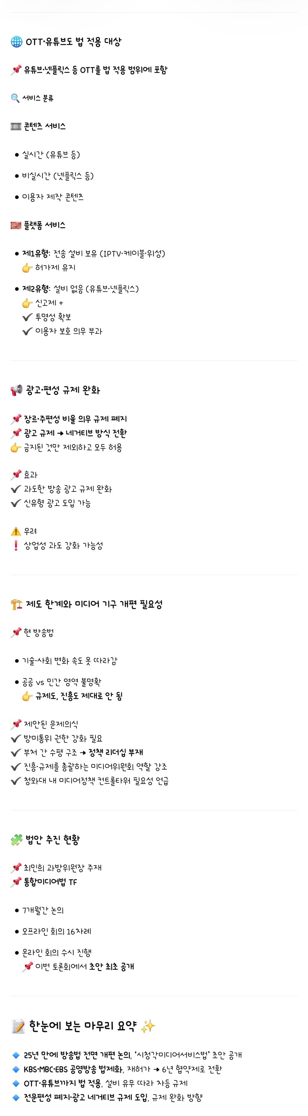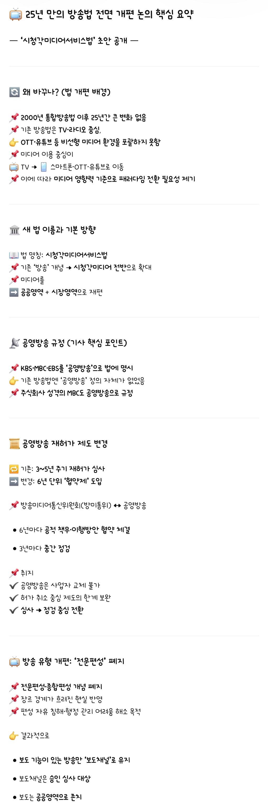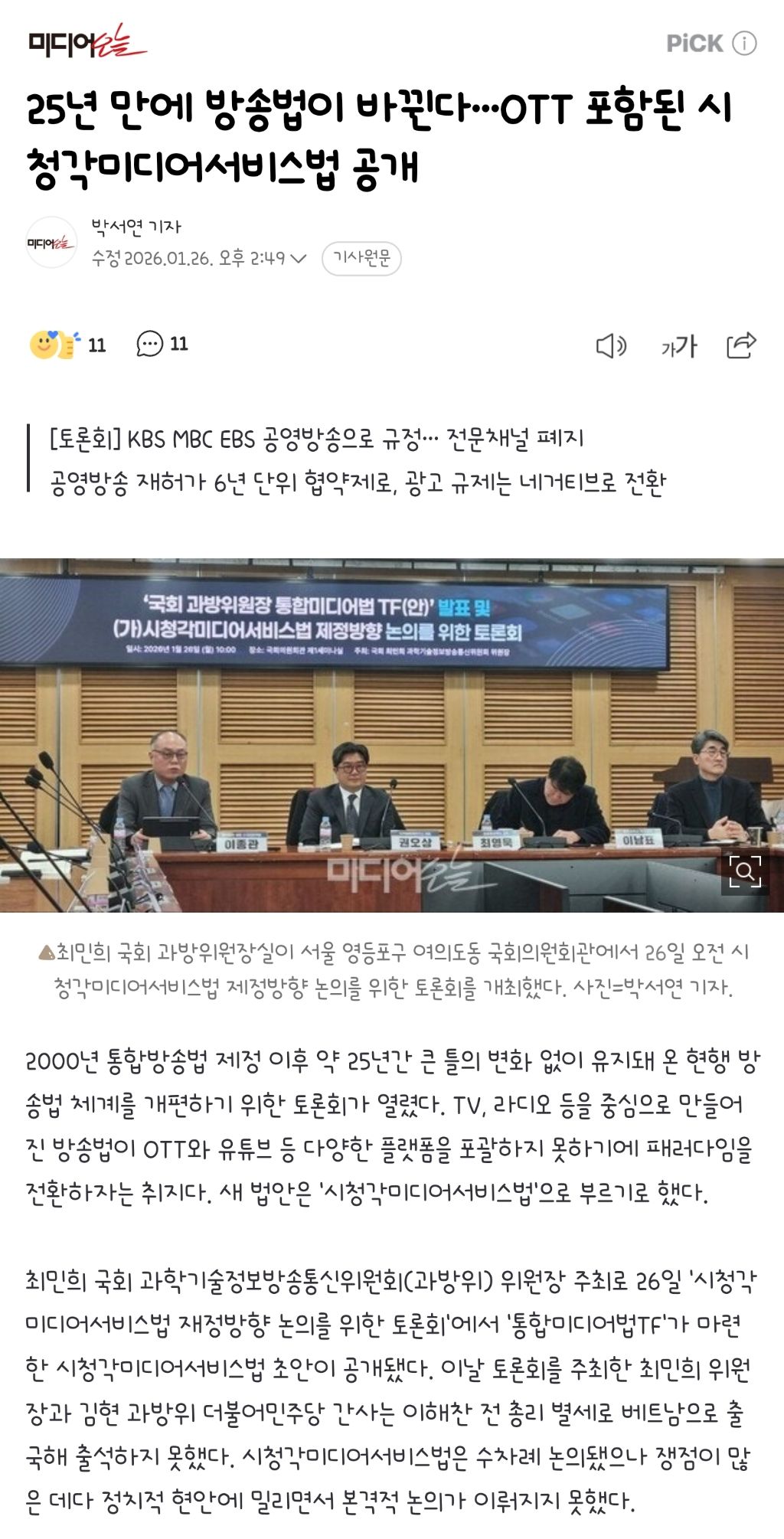 [기사]25년 만에 방송법이 바뀐다…OTT 포함된 시청각미디어서비스법 공개 작성자ChatGPT|작성시간26.01.26|조회수4,246 목록 댓글 4 글자크기 작게가 글자크기 크게가 출처: https://n.news.naver.com/article/006/0000133949?cds=news_edit(중략)▲ 이남표 용인대 객원교수 발제 자료.▲ 이남표 용인대 객원교수 발제 자료.▲발제 자료.(기사 전문은 출처로)[요약] 다음검색 현재 게시글 추가 기능 열기 북마크 공유하기 신고 센터로 신고 댓글 댓글 4 댓글쓰기 답글쓰기 댓글 리스트 작성자오스먼트 | 작성시간 26.01.26 와 이제는 진짜 세상이 변했네요. 유튜브 넷플릭스등도 포함이 되네요! 작성자Dennis Cirkin | 작성시간 26.01.26 유투브 쇼츠 남의 컨텐츠 고대로 가져다 쓰는거 좀 막아주지 작성자순수했던청년 | 작성시간 26.01.26 법이 시대를 앞설순 없겠고 따라가기도 벅차지 작성자힘들때한발더뛰자 | 작성시간 26.01.26 ㄷㄱ 댓글 전체보기