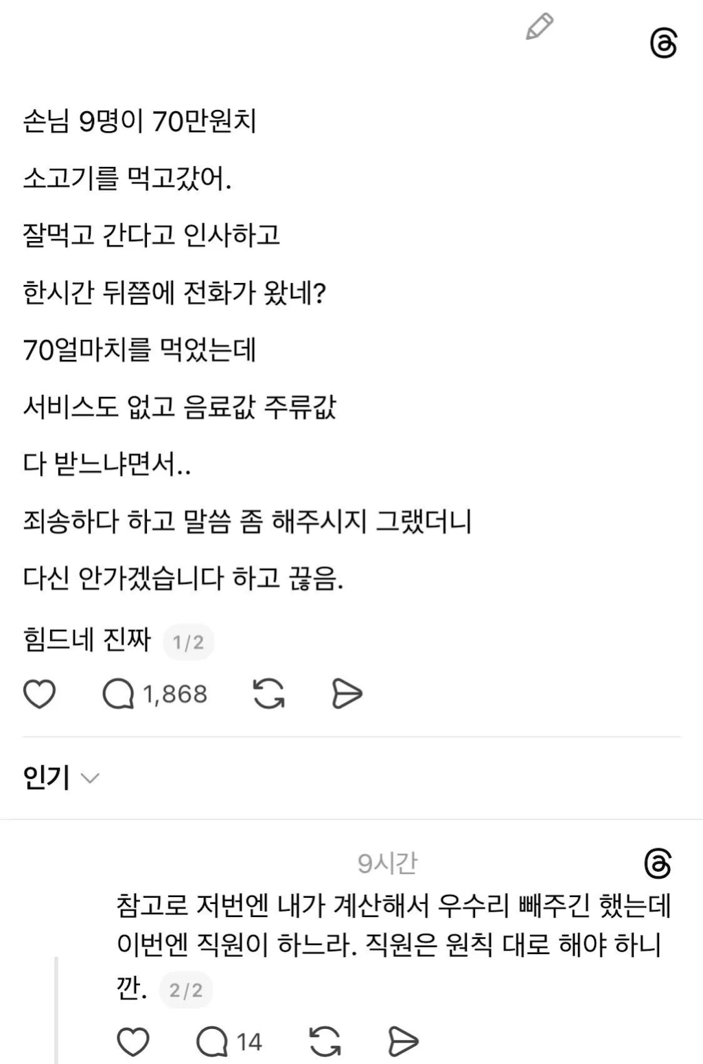 70만원 어치 먹고 간 손님에게 서비스? 작성자가을날4|작성시간26.01.27|조회수88,309 목록 댓글 17 글자크기 작게가 글자크기 크게가 다음검색 현재 게시글 추가 기능 열기 북마크 공유하기 신고 센터로 신고 댓글 댓글 17 댓글쓰기 답글쓰기 댓글 리스트 작성자에바그린 | 작성시간 26.01.27 5명이서 70넘게먹고 조용히나왔는데... 작성자MIC DROP | 작성시간 26.01.27 단가가 어느정돈지는 모르겠는데 술을 많이 안마셨나보네요ㅋㅋ 작성자Overture! | 작성시간 26.01.27 9명 70 가지고 뭔… ㅋㅋ 작성자진정성 | 작성시간 26.01.27 9명이 소고기 70만원이면 많이 먹은거도 아닌데 작성자아메리카노 | 작성시간 26.01.27 ㅋㅋㅋㅋㅋㅋㅋㅋㅋ 댓글 전체보기