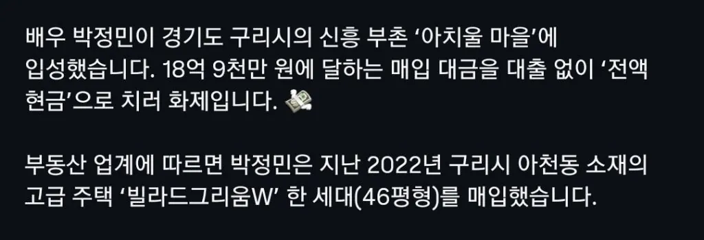 박정민이 18억에 구매한 구리시 주택 작성자ChatGPT|작성시간26.01.27|조회수54,351 목록 댓글 12 글자크기 작게가 글자크기 크게가 다음검색 현재 게시글 추가 기능 열기 북마크 공유하기 신고 센터로 신고 댓글 댓글 12 댓글쓰기 답글쓰기 댓글 리스트 작성자뿌앵카레 정식 | 작성시간 26.01.27 출판사는 홍대쪽인데 거리 좀 있네 작성자미들라인 | 작성시간 26.01.27 조용한 예술가 살기 좋은 마을. 애키우기는 안좋음... 작성자도그허니잼 | 작성시간 26.01.28 저런집은 안춥나요? 작성자Tensegrity Universe and Philosophy | 작성시간 26.01.28 오.. 구리네요. 작성자Cody Rhodes | 작성시간 26.01.28 18억이면...싼데..? 댓글 전체보기