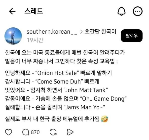 미국 동료들에게 한국말을 속성 교육하였다 작성자가을날4|작성시간26.01.28|조회수6,560 목록 댓글 5 글자크기 작게가 글자크기 크게가 다음검색 현재 게시글 추가 기능 열기 북마크 공유하기 신고 센터로 신고 댓글 댓글 5 댓글쓰기 답글쓰기 댓글 리스트 작성자골디락스 | 작성시간 26.01.28 ㅋㅋㅋㅋㅋ 작성자스티븐더풋볼제라드 | 작성시간 26.01.28 ㅋㅋㅋㅋㅋㅋㅋ따라해봄ㅋㅋㅋ 작성자갰랍랍 | 작성시간 26.01.28 Onion He Got Sale 작성자tnatropmI | 작성시간 26.01.28 ㅋㅋㅋㅋㅋ 작성자Jesse Lingard | 작성시간 26.01.28 come대신 gum으로 하지 댓글 전체보기