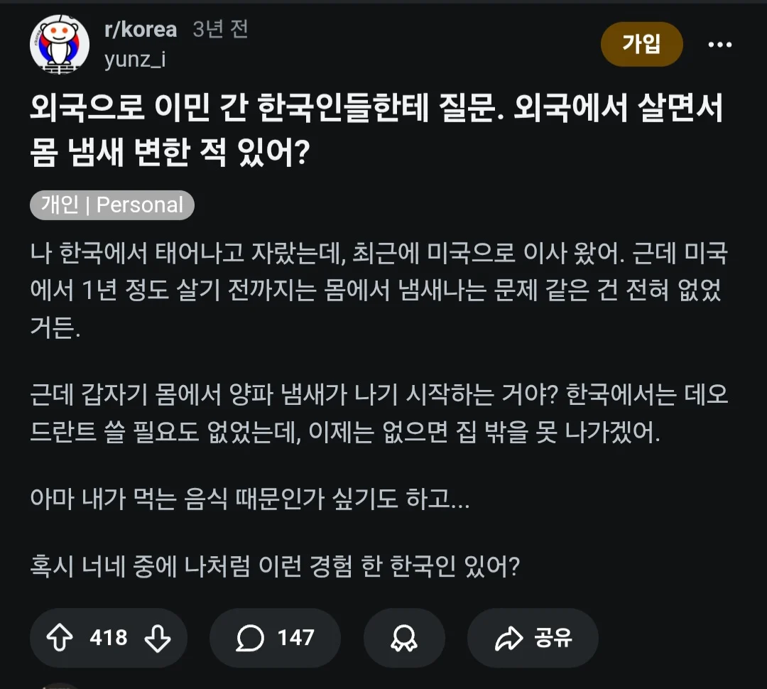 작성자호랑이굴서식중 작성시간 26.01.28 한국사람도 마늘냄새 많이 난다던데