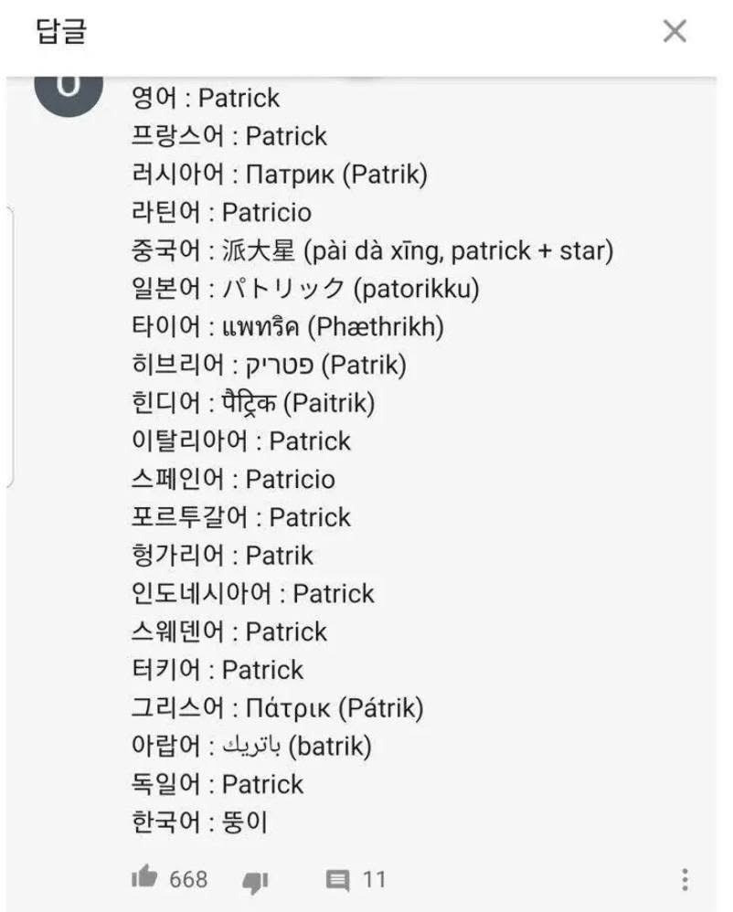 한국만 이름이 따로 생긴 캐릭터 작성자가을날4|작성시간26.01.29|조회수5,360 목록 댓글 4 글자크기 작게가 글자크기 크게가 다음검색 현재 게시글 추가 기능 열기 북마크 공유하기 신고 센터로 신고 댓글 댓글 4 댓글쓰기 답글쓰기 댓글 리스트 작성자장cod | 작성시간 26.01.29 ㅋㅋㅋㅋㅋ 진짜 뚱이가 아님 뭐임 작성자프랭크 램파드 | 작성시간 26.01.29 뚱이 이름부터 귀여움 작성자다이나믹피치 | 작성시간 26.01.29 별가 인디요ㅋ 작성자이천이십이 | 작성시간 26.01.29 뚱이 다람이 댓글 전체보기