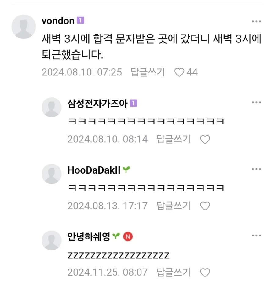 [유머]면접 합격하더라도 주의할 점 작성자가을날4|작성시간26.01.29|조회수32,662 목록 댓글 2 글자크기 작게가 글자크기 크게가 다음검색 현재 게시글 추가 기능 열기 북마크 공유하기 신고 센터로 신고 댓글 댓글 2 댓글쓰기 답글쓰기 댓글 리스트 작성자Professor | 작성시간 26.01.29 ㅋㅋㅋㅋㅋㅋㅋㅋㅋㅋㅋㅋㅋㅋ 작성자이나경 | 작성시간 26.01.29 ㅋㅋㅋㅋㅋㅋㅋㅋㅋ 댓글 전체보기