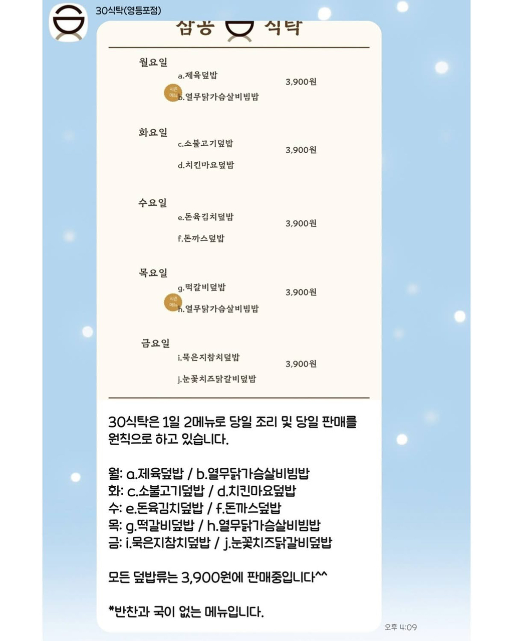 영등포 3900원 배달도시락 사업 작성자가을날4|작성시간26.01.29|조회수3,683 목록 댓글 3 글자크기 작게가 글자크기 크게가 다음검색 현재 게시글 추가 기능 열기 북마크 공유하기 신고 센터로 신고 댓글 댓글 3 댓글쓰기 답글쓰기 댓글 리스트 작성자아메리고 | 작성시간 26.01.29 착한 가격 좋네요! 작성자보건복지부 | 작성시간 26.01.29 개인적으로 자활사업이 잘 되면 좋겠지만 맛과 실사진을 봐야됨. 작성자로또1등백수 | 작성시간 26.01.29 이거 좋다 댓글 전체보기