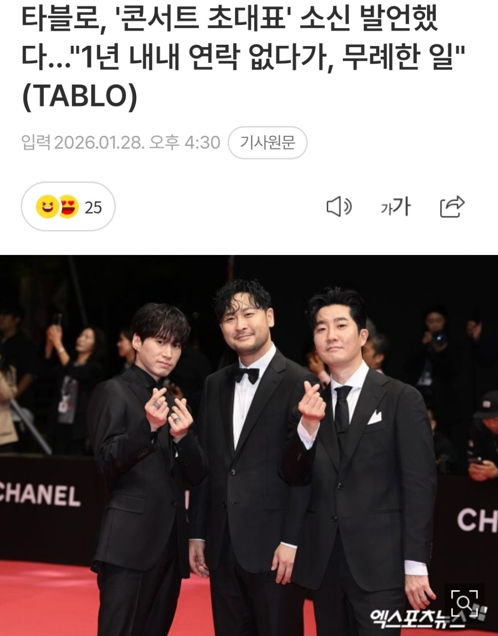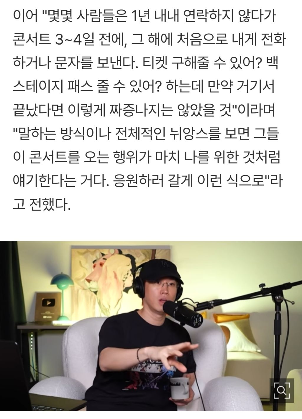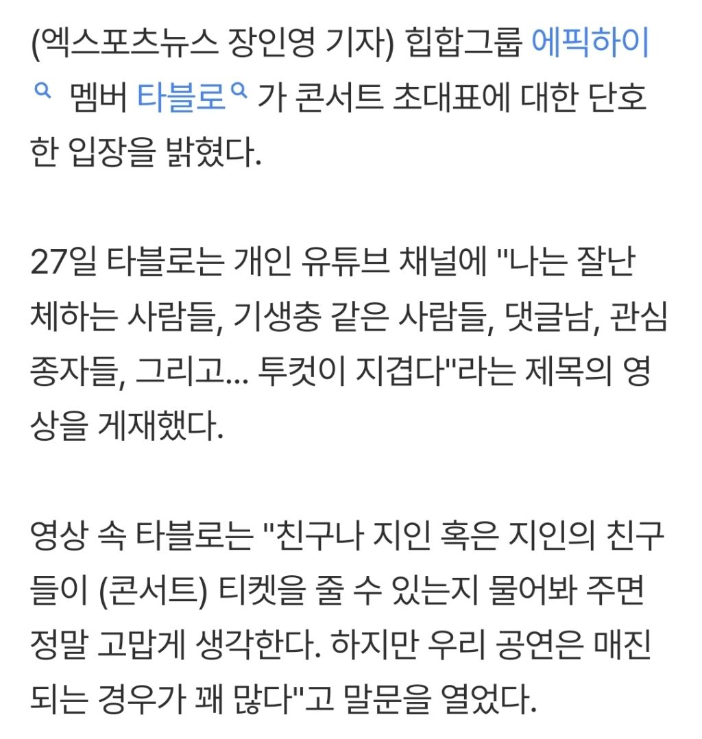 -요즘 이상하게 콘서트마다 유명 연예인들 초대석이 예전에 비해 많아진 느낌에 서로 누가누가왔나 대결하는 느낌 좀 있어서 티켓팅해서 좋아하는 가수 콘서트 가는 팬들은 혹은 실패해서 못가는 팬들도 많은데 참 이게 맞나 싶은 생각 가끔 들었는데 타블로 멋지네요