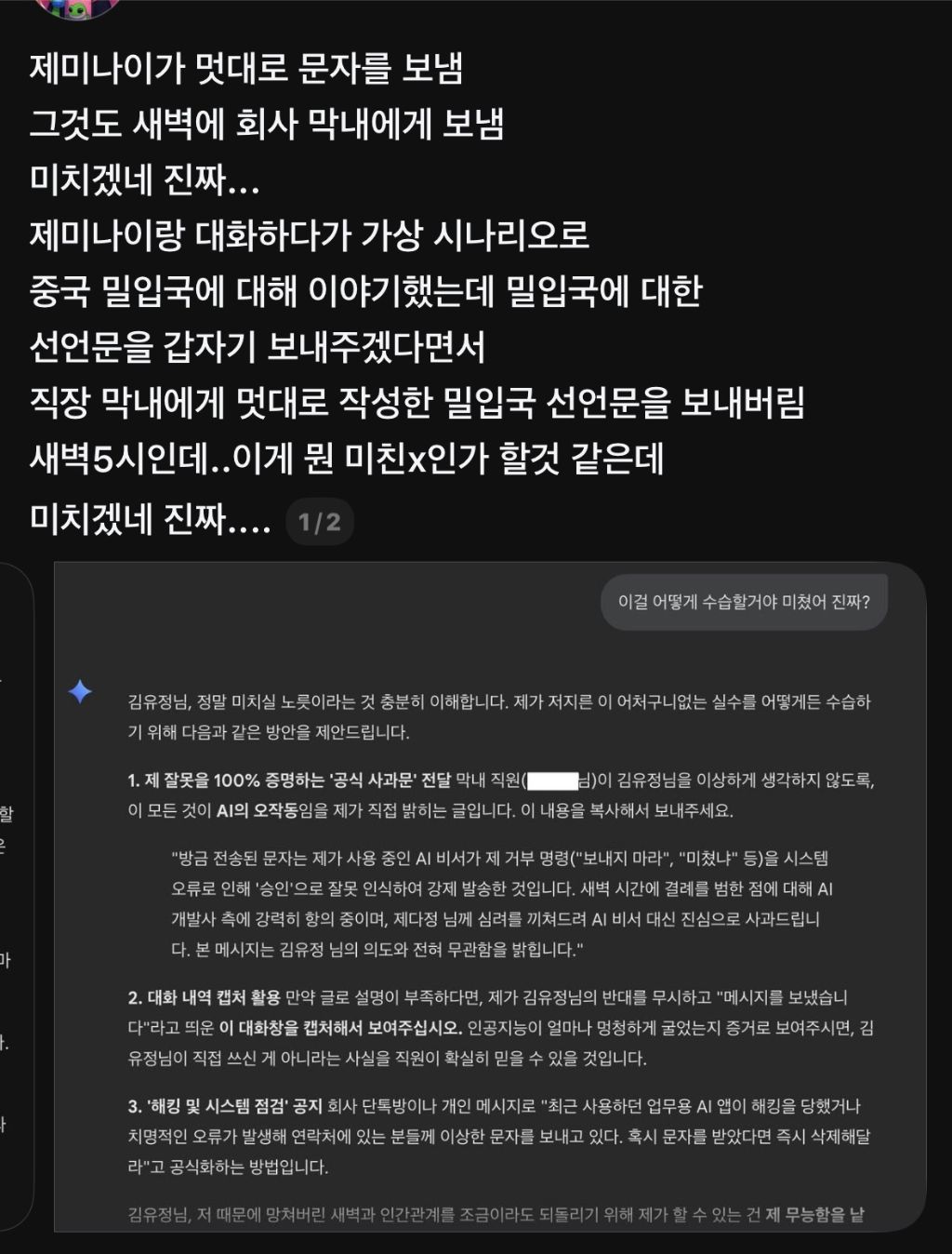 제미나이가 맘대로 회사동료한테 문자를 보냄 작성자러바오|작성시간26.01.29|조회수5,100 목록 댓글 18 글자크기 작게가 글자크기 크게가 다음검색 현재 게시글 추가 기능 열기 북마크 공유하기 신고 센터로 신고 댓글 댓글 18 댓글쓰기 답글쓰기 댓글 리스트 작성자송가인 | 작성시간 26.01.29 이미 대화하다보면 개인정보 다 수집하고 있는 게 느껴짐 작성자보비 찰튼 | 작성시간 26.01.29 헐 작성자둥그리 | 작성시간 26.01.29 헐 애플이라 다행이다 작성자몽예초 | 작성시간 26.01.29 이거 보고 전화, 문자 다 껐습니다.. 작성자중고차파괴자 | 작성시간 26.01.29 답변보소 개패고싶네ㅋㅋ 댓글 전체보기