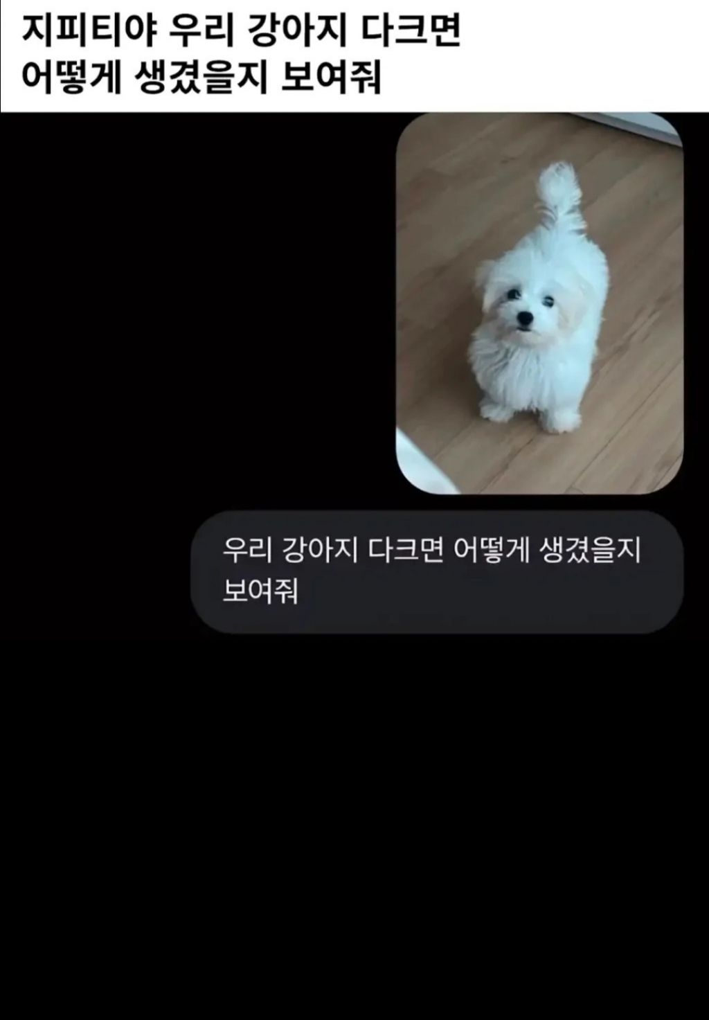 지피티야 우리 강아지 다크면 어떻게 생겼을지 보여줘 작성자Tove Styrke|작성시간26.01.29|조회수2,447 목록 댓글 4 글자크기 작게가 글자크기 크게가 다음검색 현재 게시글 추가 기능 열기 북마크 공유하기 신고 센터로 신고 댓글 댓글 4 댓글쓰기 답글쓰기 댓글 리스트 작성자마이클캐릭 | 작성시간 26.01.29 다크긴했네 작성자학생 | 작성시간 26.01.29 굳이 따지면 띄어쓰기를 다 크면으로 했어야 알아듣지 않았을지 작성자tnatropmI | 작성시간 26.01.29 ㅋㅋㅋㅋㅋㅋㅋ 작성자밀키스 | 작성시간 26.01.29 다킄ㅋㅋㅋㅋ 댓글 전체보기