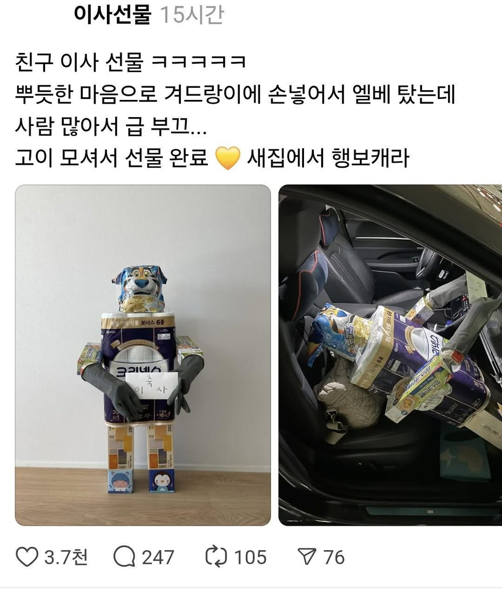 신박한 이사선물 작성자가을날4|작성시간26.01.30|조회수27,157 목록 댓글 9 글자크기 작게가 글자크기 크게가 다음검색 현재 게시글 추가 기능 열기 북마크 공유하기 신고 센터로 신고 댓글 댓글 9 댓글쓰기 답글쓰기 댓글 리스트 작성자프랭크 램파드 | 작성시간 26.01.30 ㅋㅋㅋㅋㅋㅋ 좋다 작성자리오넬메시갓 | 작성시간 26.01.30 친구집 이사해서 빈방들어갔는데저거 조세호 얼굴로있는거보고 식겁했었는데ㅋㅋ 작성자아재씨 | 작성시간 26.01.30 대가리부분 아이디어 굿 작성자SOWON | 작성시간 26.01.30 ㅋㅋㅋㅋㅋㅋ 작성자Andrea Pirlo 21 | 작성시간 26.01.30 ㅋㅋㅋㅋㅋㅋㅋㅋㅋ 댓글 전체보기