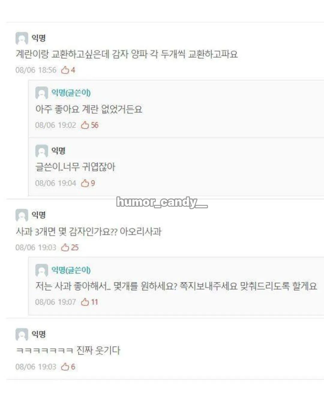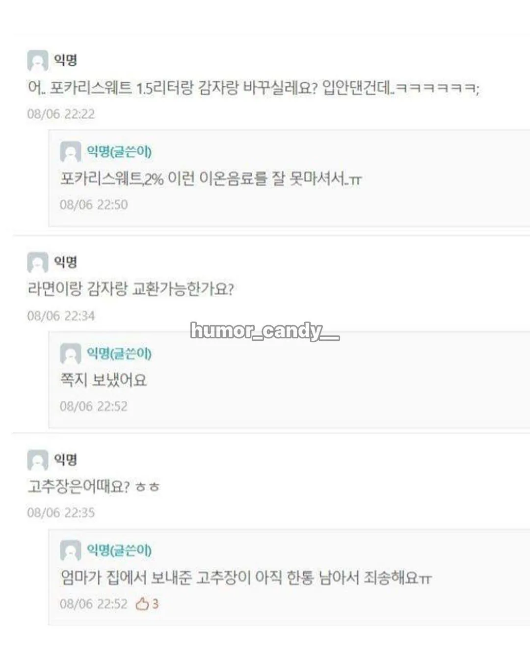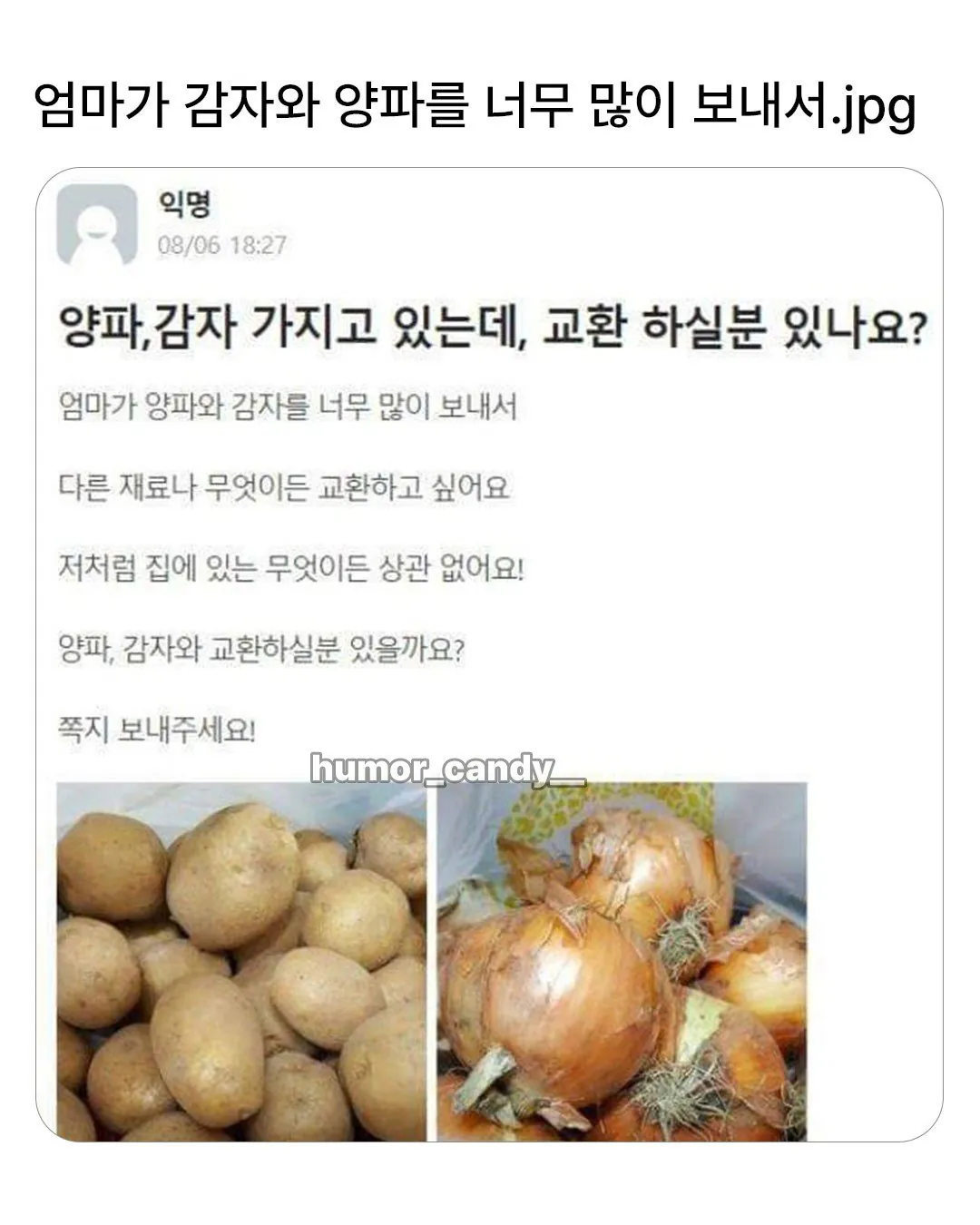 [유머]엄마가 감자랑 양파를 너무 많이 보내서.jpg 작성자강동구주민 3|작성시간26.02.01|조회수4,435 목록 댓글 2 글자크기 작게가 글자크기 크게가 다음검색 현재 게시글 추가 기능 열기 북마크 공유하기 신고 센터로 신고 댓글 댓글 2 댓글쓰기 답글쓰기 댓글 리스트 작성자분노의바르셔 | 작성시간 26.02.01 귀엽다ㅎㅎ 작성자Tensegrity Universe and Philosophy | 작성시간 26.02.01 좋네 댓글 전체보기