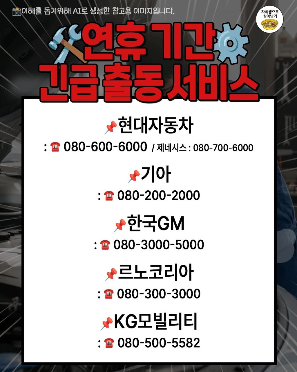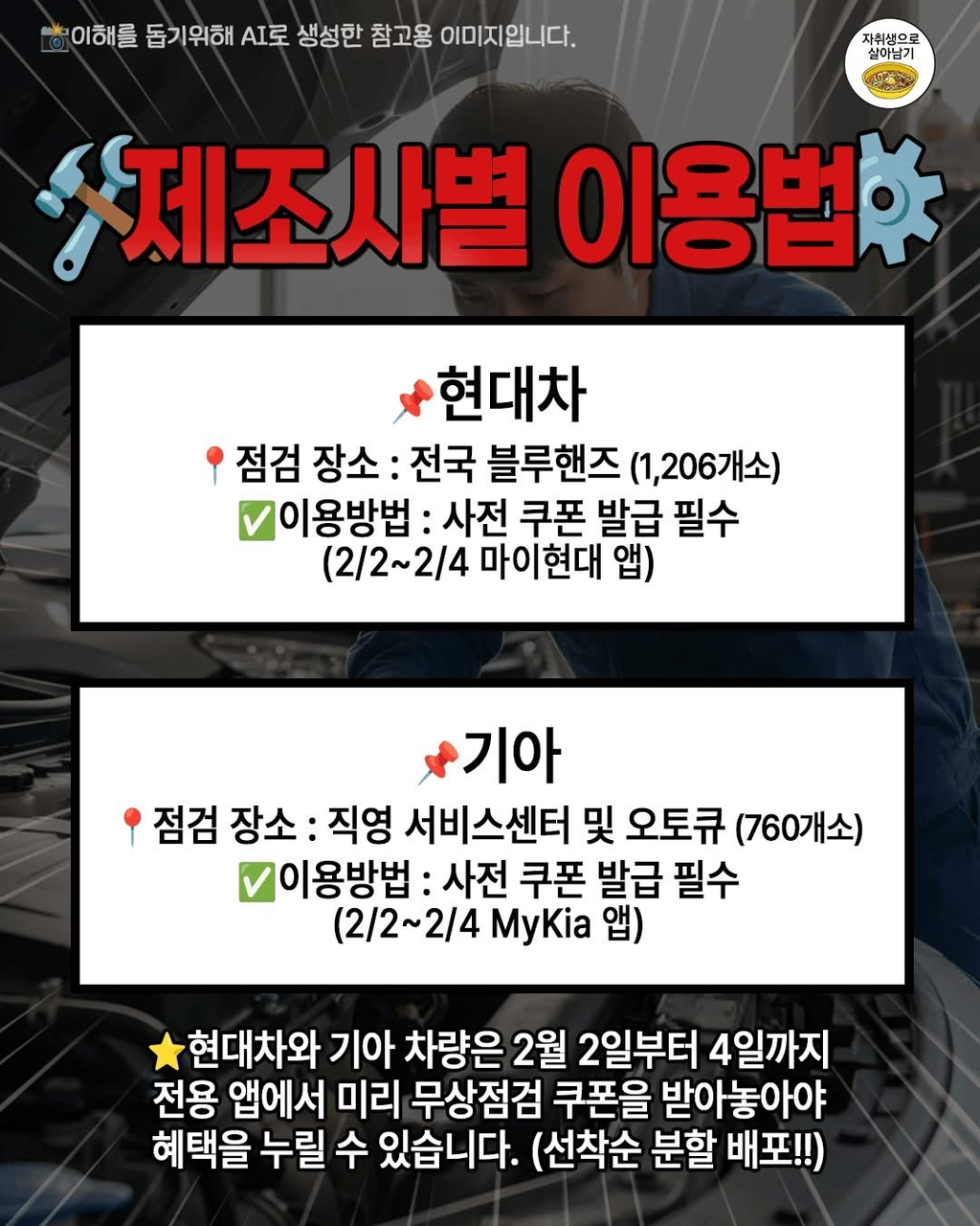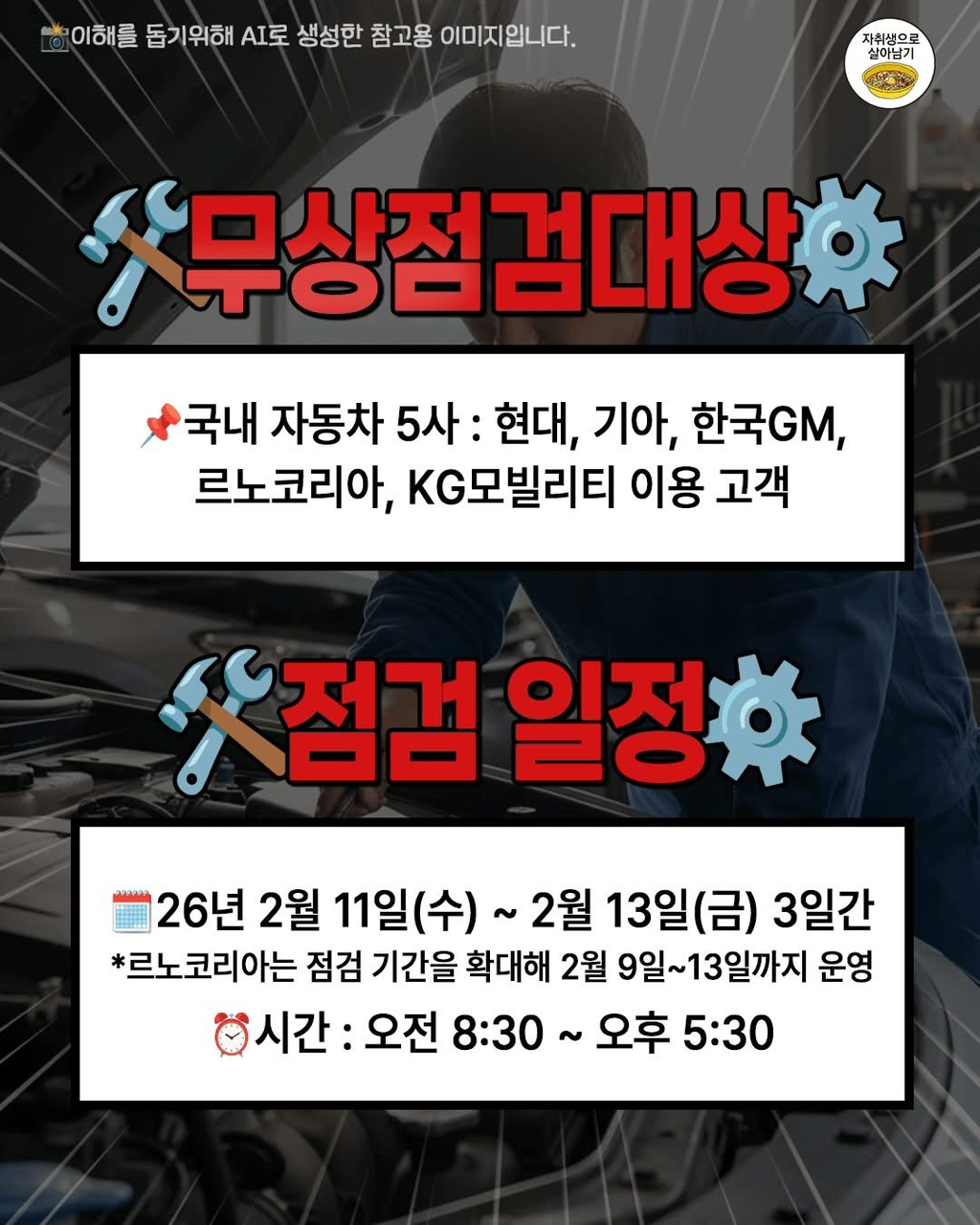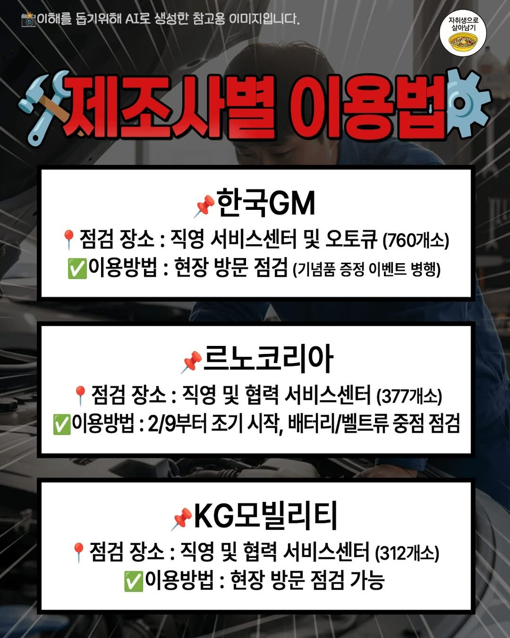설 연휴 맞이 국내 자동차 5사 무상 점검 실시 작성자가을날4|작성시간26.02.02|조회수6,765 목록 댓글 16 글자크기 작게가 글자크기 크게가 * 사전에 필히 확인 다음검색 현재 게시글 추가 기능 열기 북마크 공유하기 신고 센터로 신고 댓글 댓글 16 댓글쓰기 답글쓰기 댓글 리스트 작성자Andrey arshavin | 작성시간 26.02.02 ㄳㄳ 작성자필리포 풍자기 | 작성시간 26.02.02 오 감사 작성자정은경 | 작성시간 26.02.02 쉐보레는 서울에 직영서비스센터 안하는디.. 오토큐는 기아로 가라는거죠? 작성자맥크리 | 작성시간 26.02.02 ㄷㄱ 작성자코징이 | 작성시간 26.02.02 쉐보레 직영정비 폐쇄했는데 댓글 전체보기