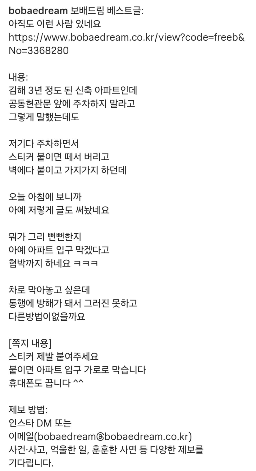아파트 주차 빌런.bobae 작성자한로로로|작성시간26.02.02|조회수4,122 목록 댓글 9 글자크기 작게가 글자크기 크게가 지 편하려고 출입구 바로 앞에 대는 것 같은데임자 만나서 ㅈ돼봐야 정신차리지... 다음검색 현재 게시글 추가 기능 열기 북마크 공유하기 신고 센터로 신고 댓글 댓글 9 댓글쓰기 답글쓰기 댓글 리스트 작성자수원의푸른별 | 작성시간 26.02.02 침 밷기 단체로 시전해야 함 작성자빈이 | 작성시간 26.02.02 저런 븅신들은 가정교육을 어찌 받아서 저러지진짜 ㅈㄴ 쳐 맞아야 정신 차릴텐데 작성자dog123 | 작성시간 26.02.02 와 극혐이네 제발 참교육 후속편나왔으면 좋겠다 작성자정예린 | 작성시간 26.02.02 어휴;;; 작성자I.B.I LUV | 작성시간 26.02.02 막아봐라 이제 법 개정 되서 처벌 가능함 끌고 나갈수도 있음 댓글 전체보기