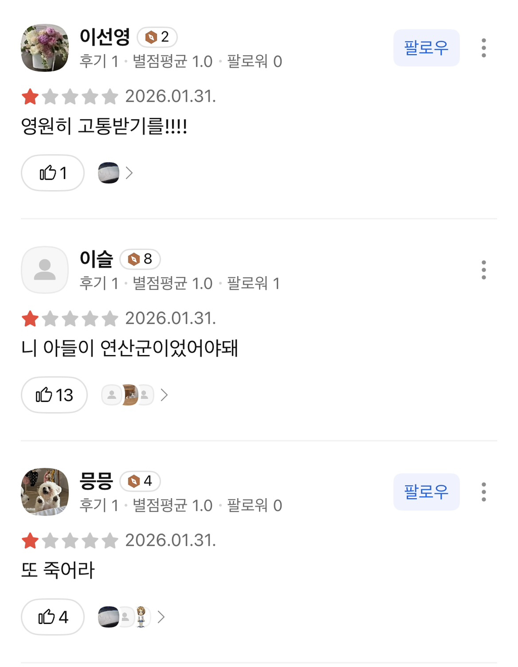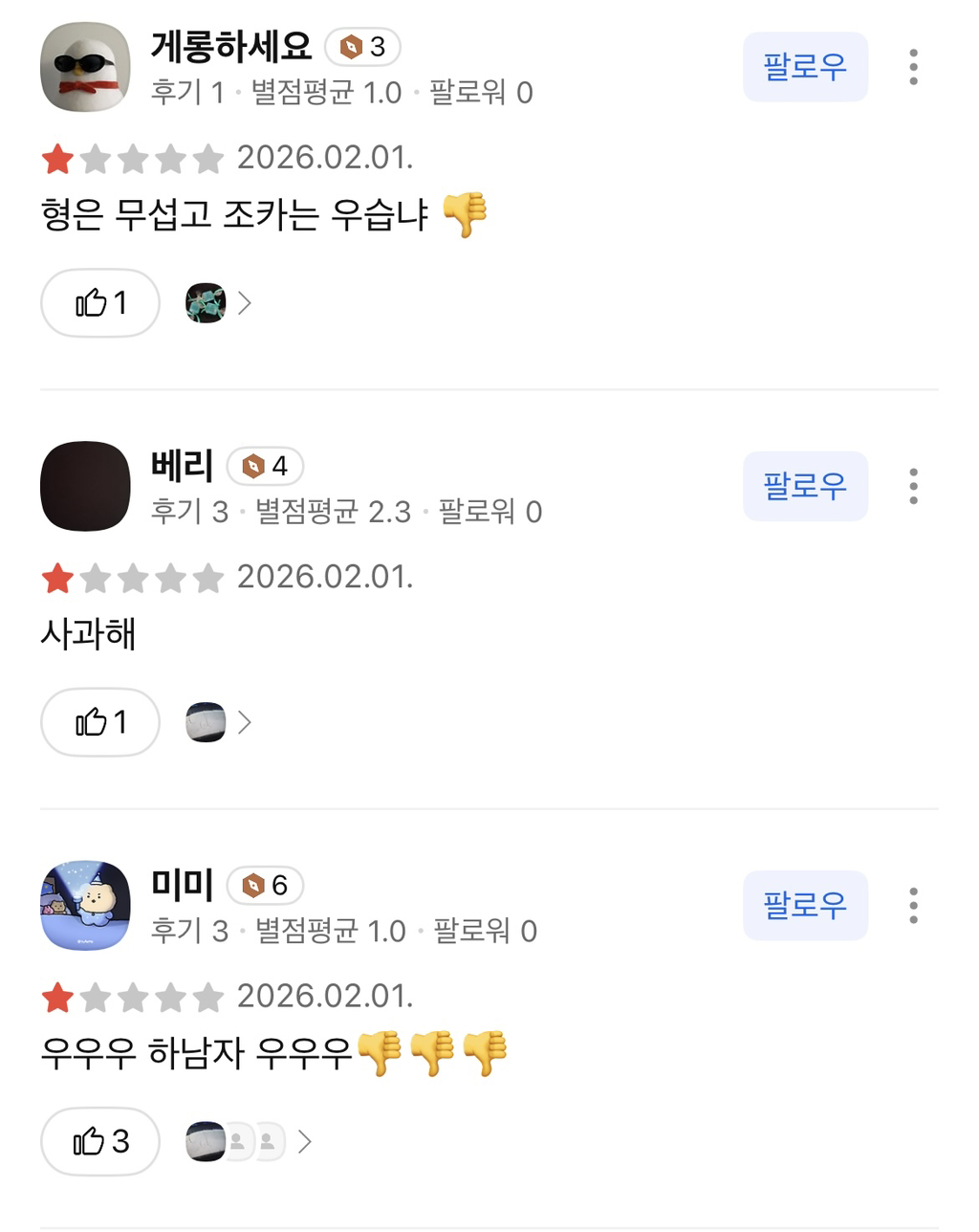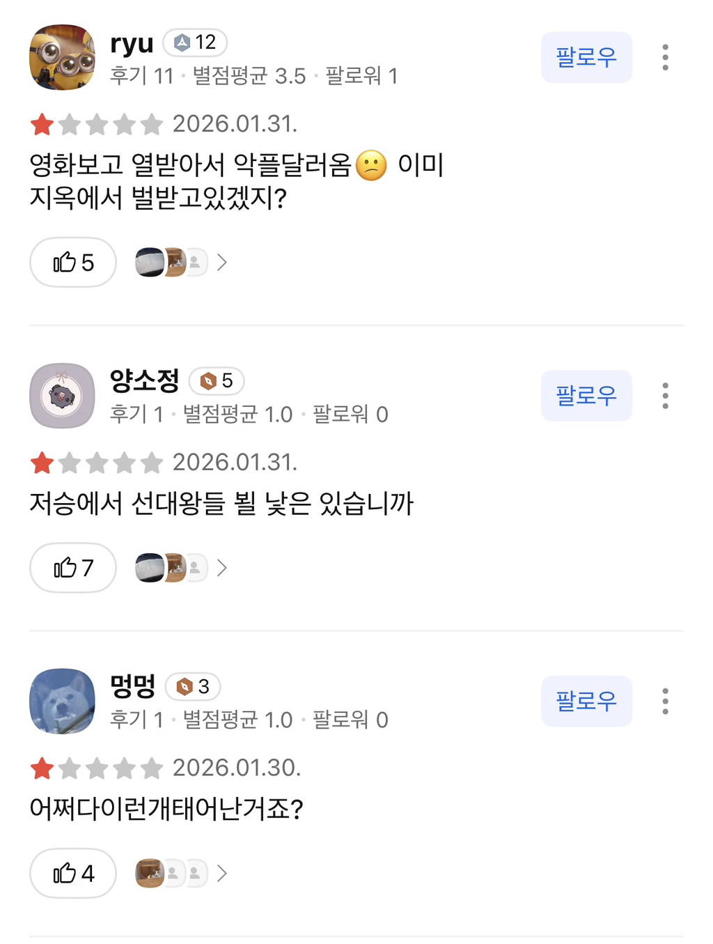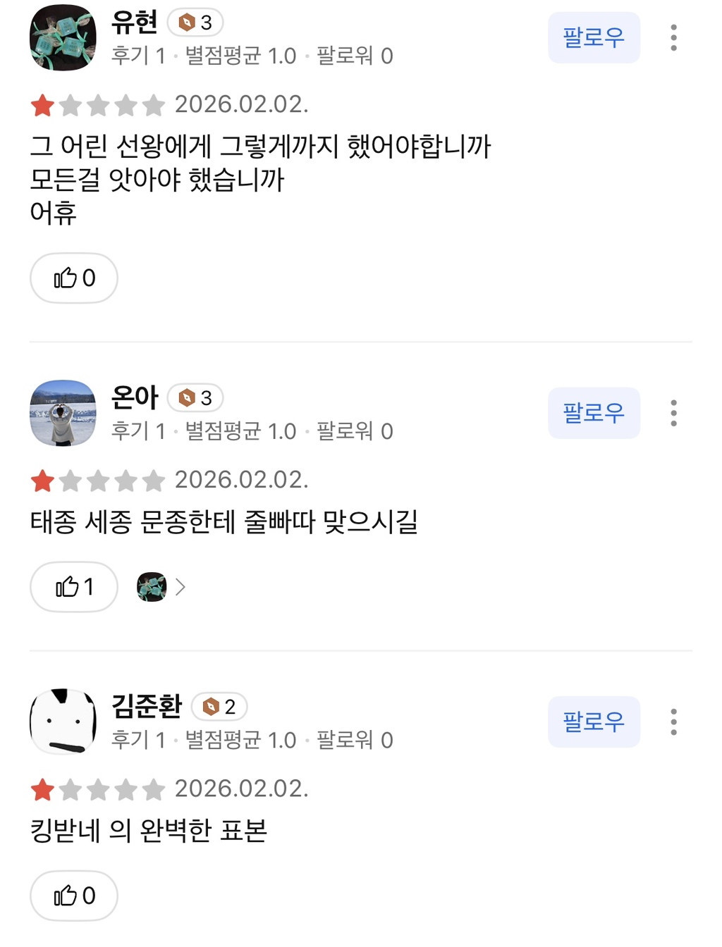 [유머]노스포) 영화 <왕과 사는 남자> 후기 작성자가을날4|작성시간26.02.02|조회수9,293 목록 댓글 12 글자크기 작게가 글자크기 크게가 광릉 세조 왕릉 별점테러중 다음검색 현재 게시글 추가 기능 열기 북마크 공유하기 신고 센터로 신고 댓글 댓글 12 댓글쓰기 답글쓰기 댓글 리스트 작성자미테미테 | 작성시간 26.02.02 개극찬 아님? ㄷㄷㄷㄷ 작성자Love | 작성시간 26.02.02 ㅋㅋㅋㅋㅋㅋㅋㅋㅋ 작성자제이슨용 | 작성시간 26.02.02 영화보려고했는데 1점보고 별로인줄 알았네 꼭봐야겠다ㅋㅋㅋ 작성자싱스트리트 | 작성시간 26.02.02 잘 뽑았나보네 ㅋㅋㅋㅋㅋㅋ 작성자jangs | 작성시간 26.02.03 잘 나왔나본데? 댓글 전체보기
