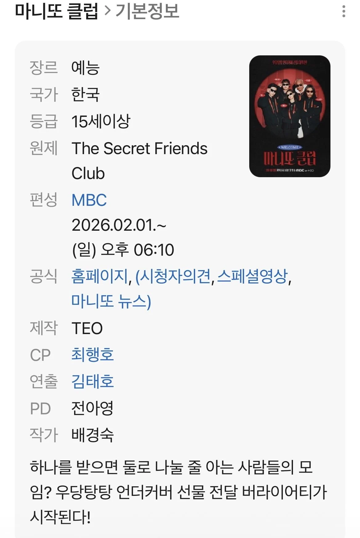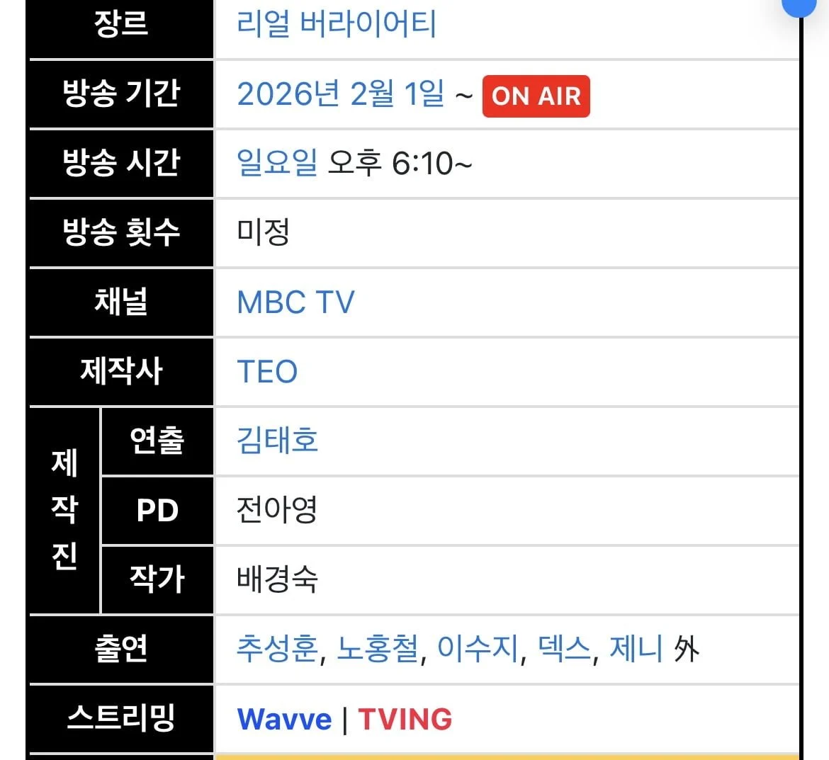 출연진 화려하다는 김태호PD 새 예능 작성자ChatGPT|작성시간26.02.02|조회수13,496 목록 댓글 19 글자크기 작게가 글자크기 크게가 다음검색 현재 게시글 추가 기능 열기 북마크 공유하기 신고 센터로 신고 댓글 댓글 19 댓글쓰기 답글쓰기 댓글 리스트 작성자asapasap | 작성시간 26.02.02 또 추성훈? 작성자FRMK224 | 작성시간 26.02.02 ...참 작성자최정민 | 작성시간 26.02.03 김태호꺼는 재미가 없음 작성자jangs | 작성시간 26.02.03 함 봐봐야겠네 작성자밥가져와밥 | 작성시간 26.02.03 봤는데 쏘쏘 댓글 전체보기
