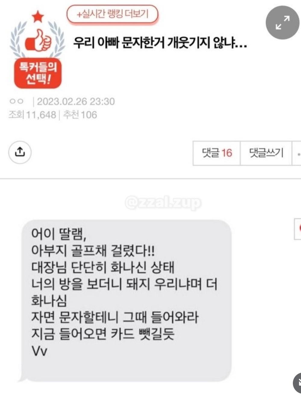 아빠랑 한 카톡 작성자러바오|작성시간26.02.03|조회수50,236 목록 댓글 2 글자크기 작게가 글자크기 크게가 다음검색 현재 게시글 추가 기능 열기 북마크 공유하기 신고 센터로 신고 댓글 댓글 2 댓글쓰기 답글쓰기 댓글 리스트 작성자뽀무빵삑 | 작성시간 26.02.03 심심하세요가 너뮤 웃김ㅋㅋㅋㅋㅋ 작성자정예린 | 작성시간 26.02.03 ㅋㅋㅋㅋ 댓글 전체보기