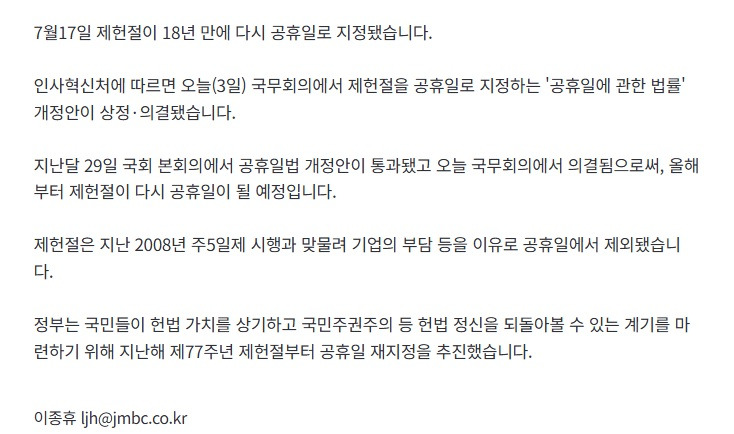 [기사][속보] 제헌절, 18년 만에 공휴일 부활.. 국무회의 의결 작성자음교수|작성시간26.02.03|조회수3,929 목록 댓글 20 글자크기 작게가 글자크기 크게가 https://n.news.naver.com/article/659/0000041056?cds=news_media_pc&type=breakingnews[속보] 제헌절, 18년 만에 공휴일 부활.. 국무회의 의결7월17일 제헌절이 18년 만에 다시 공휴일로 지정됐습니다. 인사혁신처에 따르면 오늘(3일) 국무회의에서 제헌절을 공휴일로 지정하는 '공휴일에 관한 법률' 개정안이 상정·의결됐습니다. 지난달 n.news.naver.com 다음검색 현재 게시글 추가 기능 열기 북마크 공유하기 신고 센터로 신고 댓글 댓글 20 댓글쓰기 답글쓰기 댓글 리스트 작성자깊은 밤을 날아서 | 작성시간 26.02.03 다 양보해도 개천절이 공휴일인데 제헌절이 아닌 게 말이 안됨 작성자정예린 | 작성시간 26.02.03 ㅅㅅㅅㅅㅅ 작성자고종현 | 작성시간 26.02.03 작성자호흡과공명 | 작성시간 26.02.03 위헌적 계엄으로 다시금 헌법의 가치를 되새길 수 있도록 하는 아주 의미있는 조치라 생각됩니다 작성자커뮤에서일하는척하는 부류 극혐 | 작성시간 26.02.03 좋다 댓글 전체보기