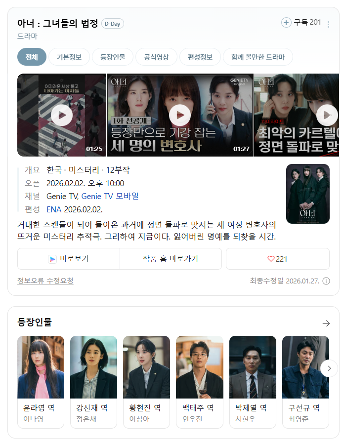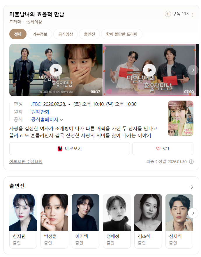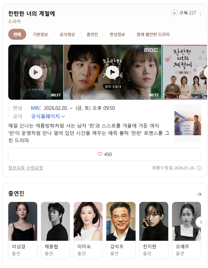 [연예]2026 2월 방영예정 TV 드라마 라인업.jpg 작성자탱구|작성시간26.02.03|조회수392 목록 댓글 0 글자크기 작게가 글자크기 크게가 2일 ENA 월화아너 4일 tvN 수목우주를 줄게 20일 MBC 금토찬란한 너의 계절에 28일 JTBC 토일미혼남녀의 효울적 만남 다음검색 현재 게시글 추가 기능 열기 북마크 공유하기 신고 센터로 신고 댓글 댓글 0 댓글쓰기 답글쓰기 댓글 리스트
