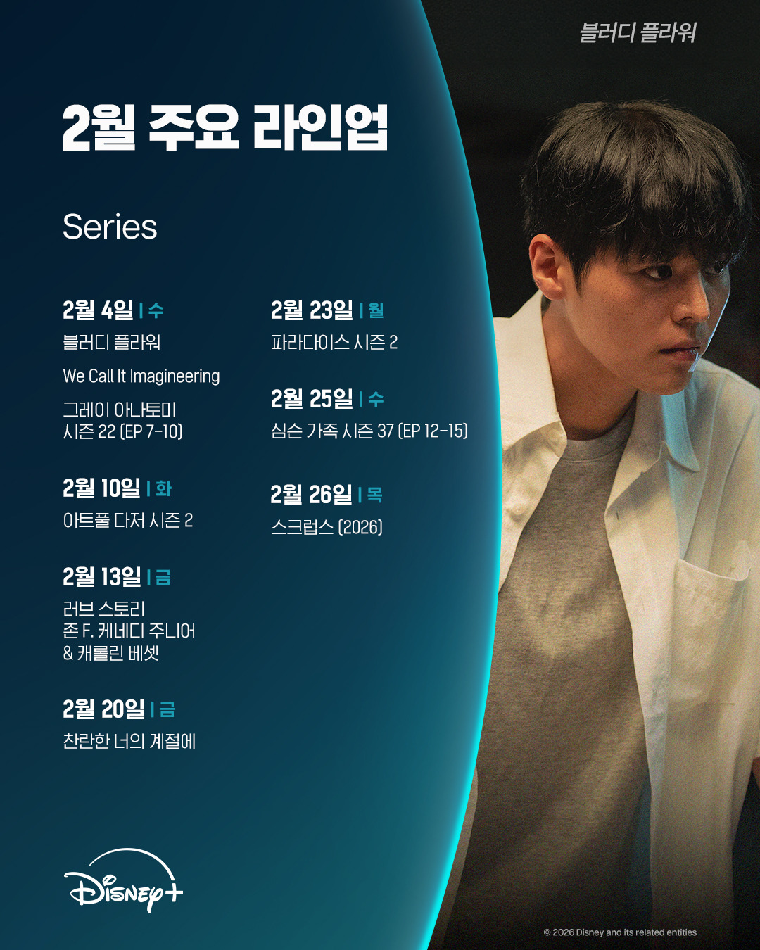 [연예]2026 2월 디즈니플러스 공개 예정작 라인업.jpg 작성자탱구|작성시간26.02.03|조회수2,898 목록 댓글 1 글자크기 작게가 글자크기 크게가 다음검색 현재 게시글 추가 기능 열기 북마크 공유하기 신고 센터로 신고 댓글 댓글 1 댓글쓰기 답글쓰기 댓글 리스트 작성자오스먼트 | 작성시간 26.02.03 내일 블러디 플라워 하는구나! 댓글 전체보기