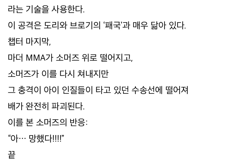 원피스 1173화 짧스포 작성자가을날4|작성시간26.02.04|조회수3,811 목록 댓글 3 글자크기 작게가 글자크기 크게가 다음검색 현재 게시글 추가 기능 열기 북마크 공유하기 신고 센터로 신고 댓글 댓글 3 댓글쓰기 답글쓰기 댓글 리스트 작성자발루아블레 | 작성시간 26.02.04 마더mma가 뭐지 작성자맨밥 | 작성시간 26.02.04 몽마를 MMA라 쓰는 듯. 애들 꿈속에 나오는 괴물이 몽마로 실체화되는데, 아이들 중 화가 잔뜩 난 무서운 엄마가 나오는 악몽을 꾼 아이가 있음. 용감한 거인 전사들도 엄마 몽마는 무서워하는 장면이 나옴. 작성자아메리카노 | 작성시간 26.02.04 오호 댓글 전체보기