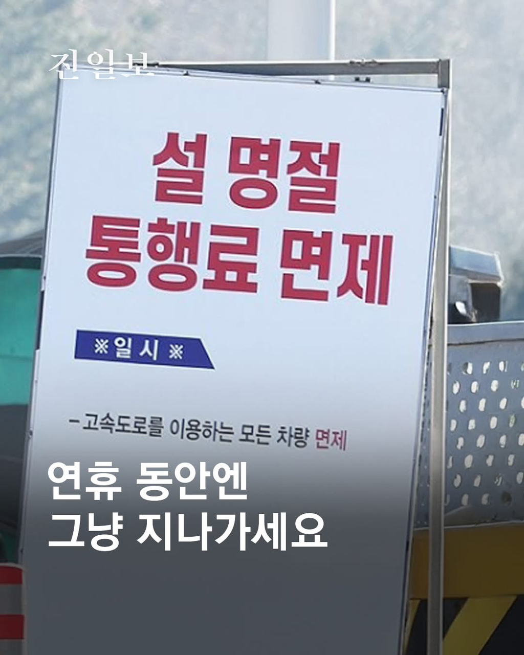 설 명절 고속도로 통행료 면제 작성자가을날4|작성시간26.02.04|조회수3,091 목록 댓글 3 글자크기 작게가 글자크기 크게가 2월 15-18일까지 면제13-18일 KTX SRT 일부 3-50% 할인출처 전남일보 다음검색 현재 게시글 추가 기능 열기 북마크 공유하기 신고 센터로 신고 댓글 댓글 3 댓글쓰기 답글쓰기 댓글 리스트 작성자정예린 | 작성시간 26.02.04 감사합니다 작성자치타 | 작성시간 26.02.04 14일부터 해주지ㅠㅠ 작성자H1-KEY 리이나 | 작성시간 26.02.04 ktx 설 예매할때 할인된 가격이엿나?;;; 댓글 전체보기