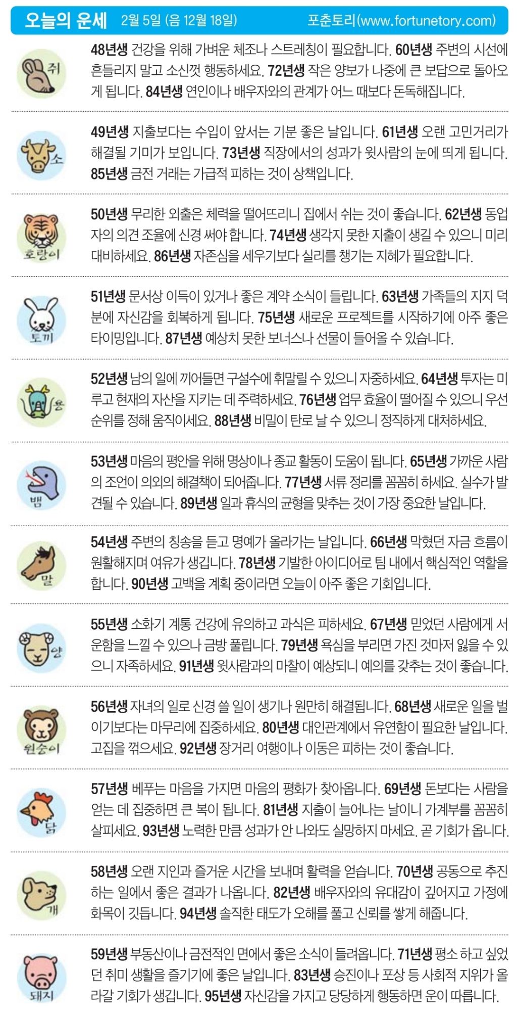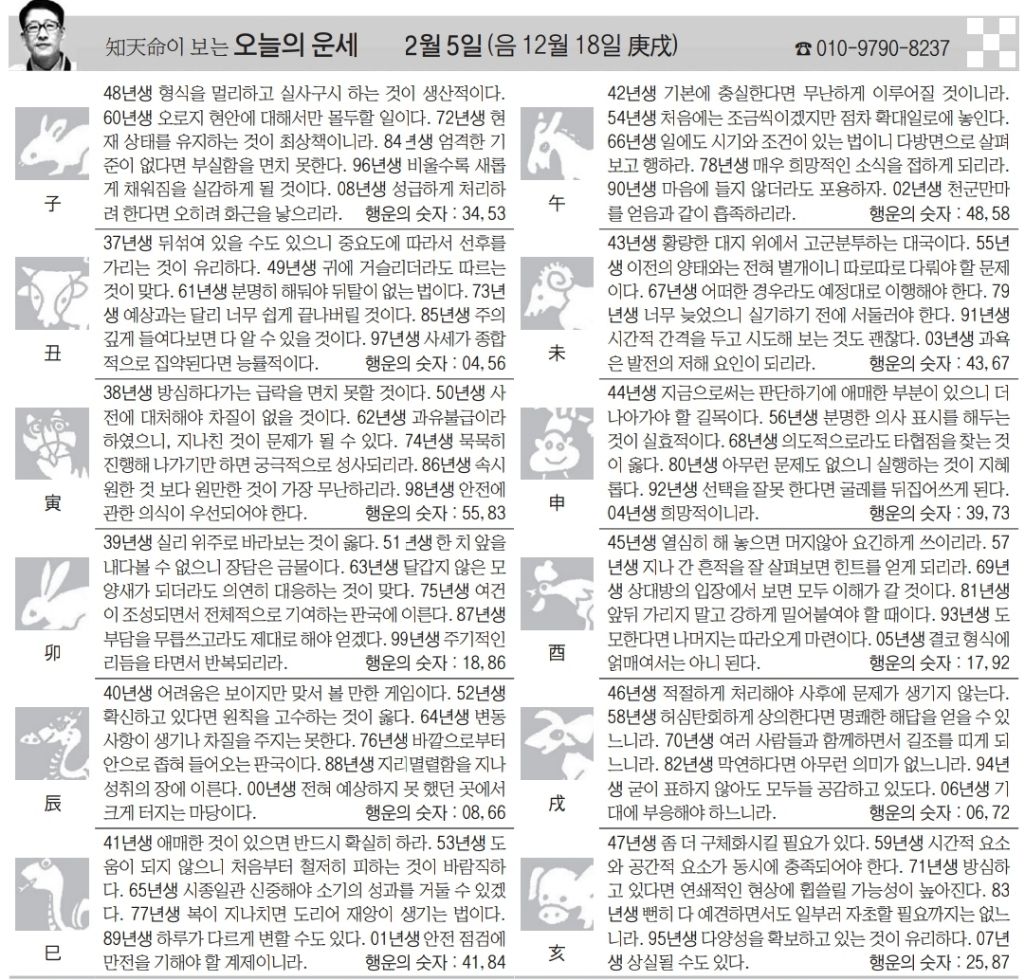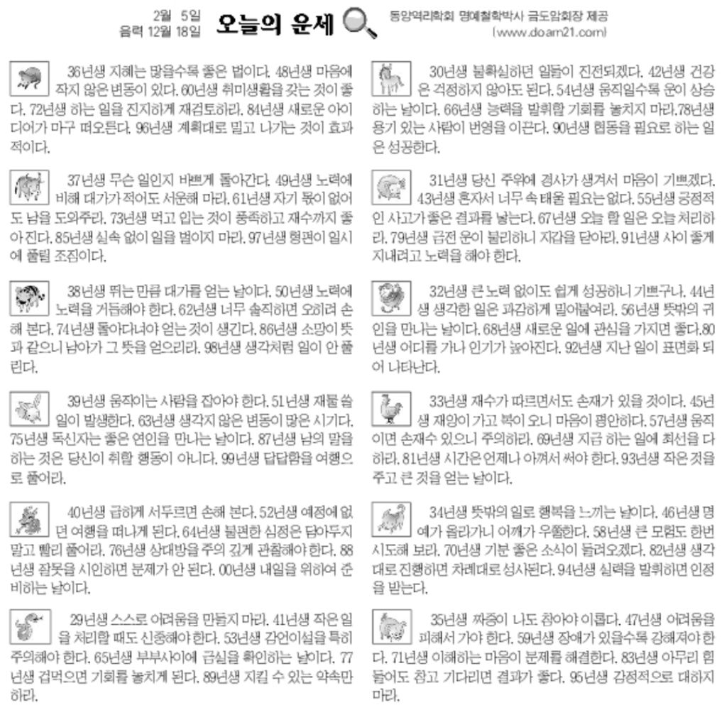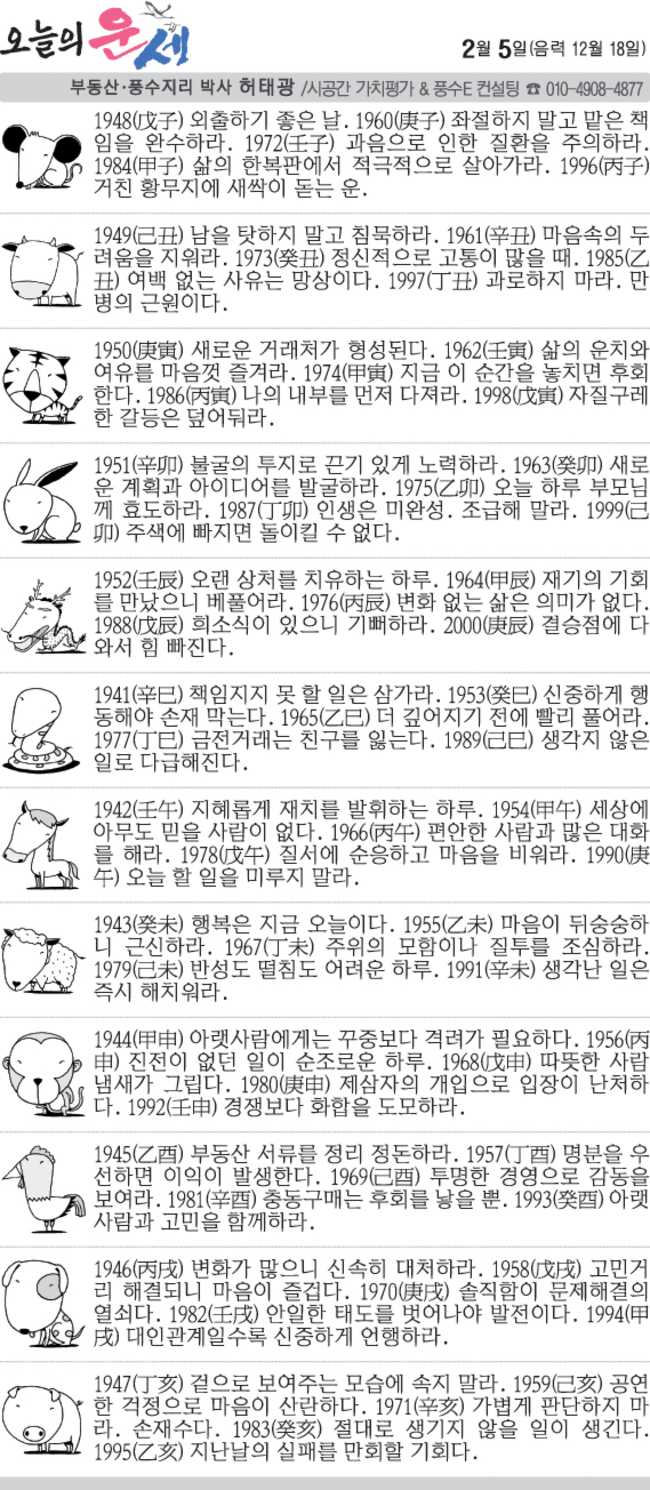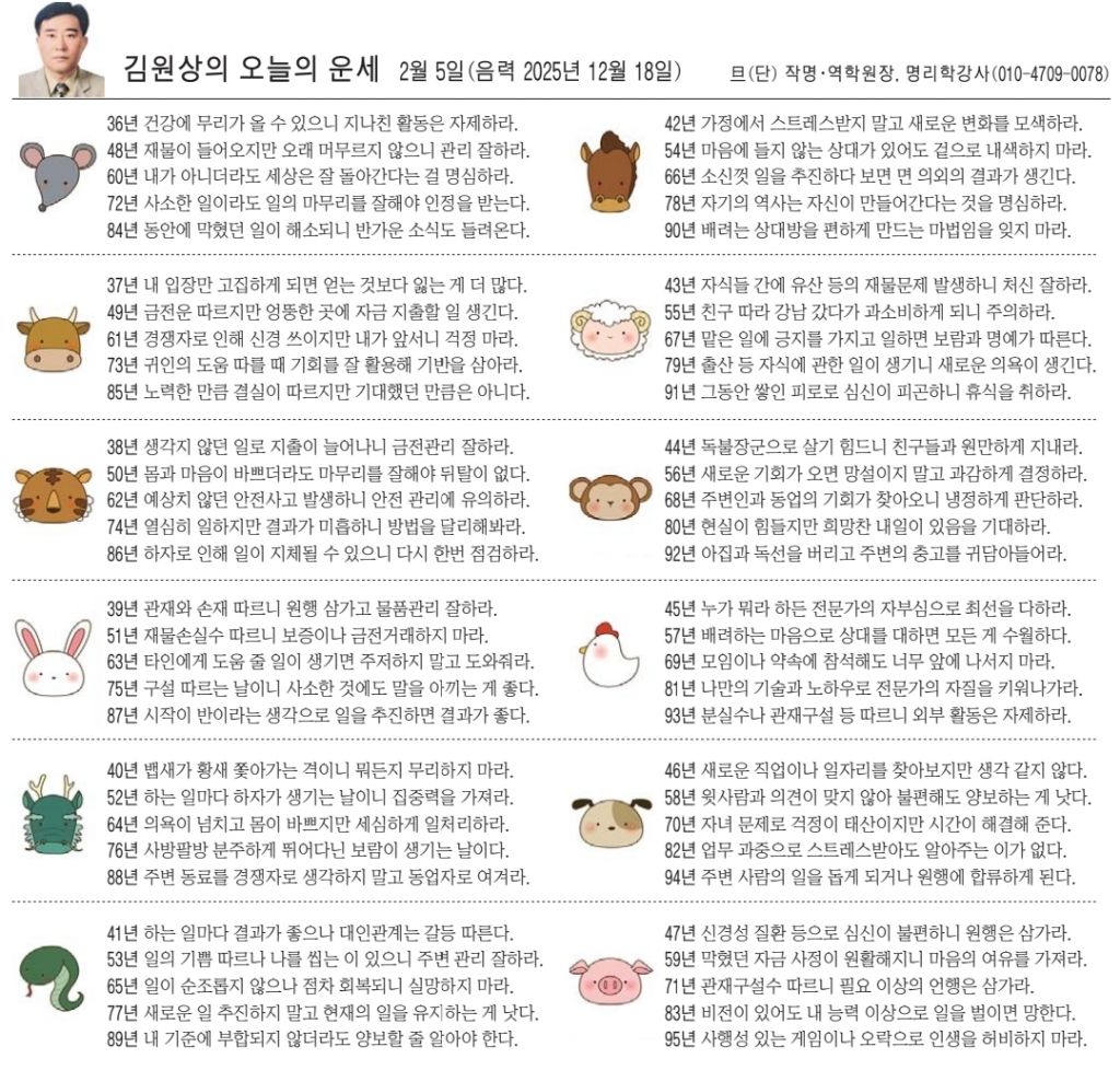 2월 5일 목요일 오늘의 운세 작성자난누군가또여긴어딘가.|작성시간26.02.05|조회수2,910 목록 댓글 12 글자크기 작게가 글자크기 크게가 다음검색 현재 게시글 추가 기능 열기 북마크 공유하기 신고 센터로 신고 댓글 댓글 12 댓글쓰기 답글쓰기 댓글 리스트 작성자5홉니다 | 작성시간 26.02.05 복채요 작성자수원블루맨1 | 작성시간 26.02.05 복채요 작성자Andrea Pirlo 21 | 작성시간 26.02.05 복채요! 작성자펭송합니다 | 작성시간 26.02.05 복채요 작성자부처님 | 작성시간 26.02.05 복채요! 댓글 전체보기
