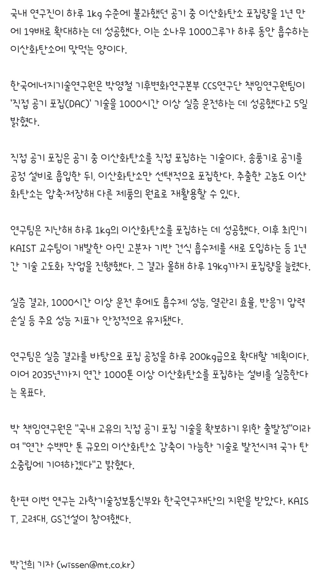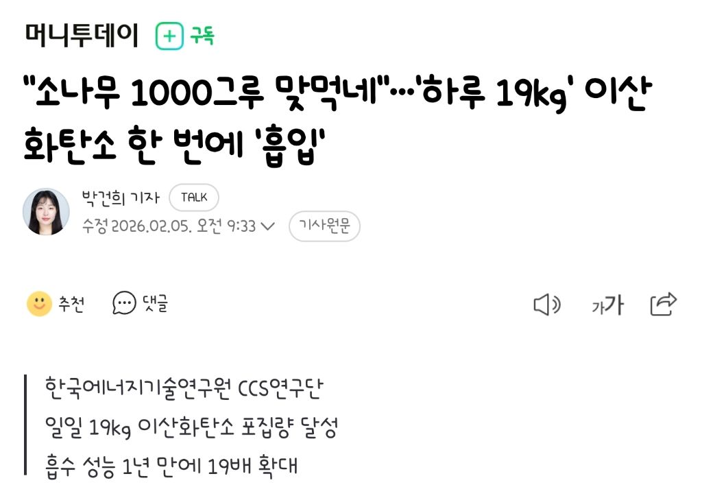 [기사]"소나무 1000그루 맞먹네"…'하루 19㎏' 이산화탄소 한 번에 '흡입' 작성자ChatGPT|작성시간26.02.05|조회수4,274 목록 댓글 5 글자크기 작게가 글자크기 크게가 출처: https://n.news.naver.com/mnews/article/008/0005314324'직접 공기 포집' (DAC) 기술의 원리를 설명한 모식도 /사진=한국에너지기술연구원요약 無 다음검색 현재 게시글 추가 기능 열기 북마크 공유하기 신고 센터로 신고 댓글 댓글 5 댓글쓰기 답글쓰기 댓글 리스트 작성자현빈 | 작성시간 26.02.05 사용화해서 큰돈 버시길 작성자울산 현대 | 작성시간 26.02.05 우리나라엔 묻을 데가 없을테고 호주나 미국 같은데로 보내서 이산화탄소 저장할라나 작성자amurta | 작성시간 26.02.05 작성자롸빠 | 작성시간 26.02.05 와 대박스 작성자奇誠庸 | 작성시간 26.02.05 와 곳곳에 도입 좀 댓글 전체보기