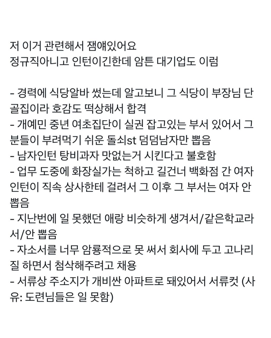 당장 우리회사도 최근에 여직원들 많이뽑혀서 올해 신입은 남자만 뽑음. 여자지원자들이 점수가 더 높았음에도 불구하고