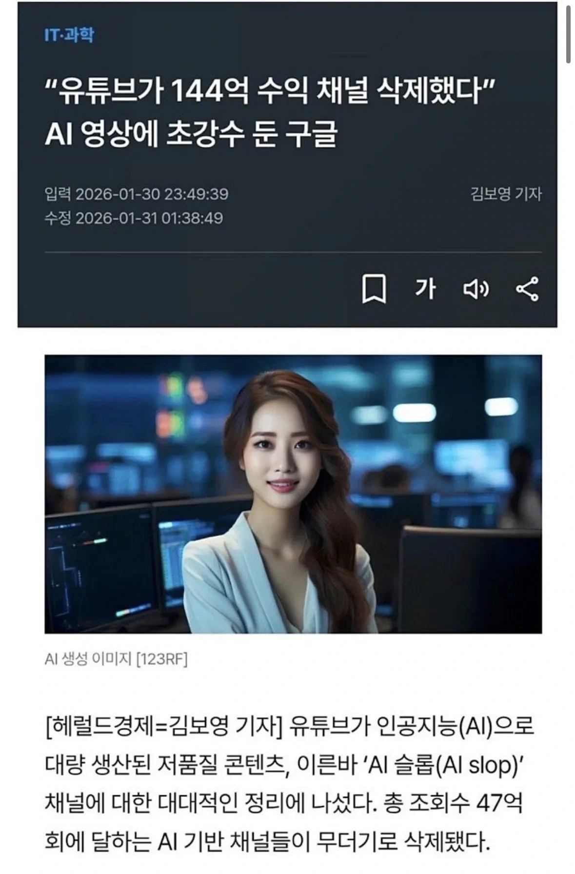 [기사]칼 빼든 유튜브, 가짜 AI채널 전부 삭제한다 작성자rade bogdanovic|작성시간26.02.06|조회수9,235 목록 댓글 18 글자크기 작게가 글자크기 크게가 다음검색 현재 게시글 추가 기능 열기 북마크 공유하기 신고 센터로 신고 댓글 댓글 18 댓글쓰기 답글쓰기 댓글 리스트 작성자Musiro | 작성시간 26.02.06 굳굳 작성자몽예초 | 작성시간 26.02.06 부작용으로 영어 듣기 공부하기 좋은 채널 수익 창출 정지 당해서 없어지게 생겼음 답댓글 작성자집중하는시간 | 작성시간 26.02.06 야나두는 살려라!! 작성자아메리카노 | 작성시간 26.02.06 굿 굿 작성자I’d rather be ashes than dust | 작성시간 26.02.07 ㄱㄱㄱㄱ 댓글 전체보기