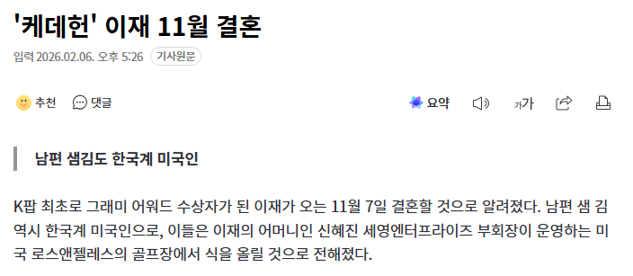 [연예]'케데헌' 이재 11월 결혼 작성자음교수|작성시간26.02.06|조회수10,466 목록 댓글 17 글자크기 작게가 글자크기 크게가 https://n.news.naver.com/article/009/0005633696'케데헌' 이재 11월 결혼남편 샘김도 한국계 미국인 K팝 최초로 그래미 어워드 수상자가 된 이재가 오는 11월 7일 결혼할 것으로 알려졌다. 남편 샘 김 역시 한국계 미국인으로, 이들은 이재의 어머니인 신혜진 세영엔터n.news.naver.com 다음검색 현재 게시글 추가 기능 열기 북마크 공유하기 신고 센터로 신고 댓글 댓글 17 댓글쓰기 답글쓰기 댓글 리스트 작성자I’d rather be ashes than dust | 작성시간 26.02.06 와 작성자빈이 | 작성시간 26.02.06 아~ 원래 있는집 딸램 이었구나 답댓글 작성자아일릿 | 작성시간 26.02.07 엄청 부자라고 하더라구요 답댓글 작성자빈이 | 작성시간 26.02.07 아일릿 몰랐는데 신영균 원로배우님 외손녀 였군요 ㅎㅎ그럼 당연 금수저 집안 ㅋㅋ 작성자커뮤에서일하는척하는 부류 극혐 | 작성시간 26.02.06 ㅊㅊㅊㅊ 댓글 전체보기