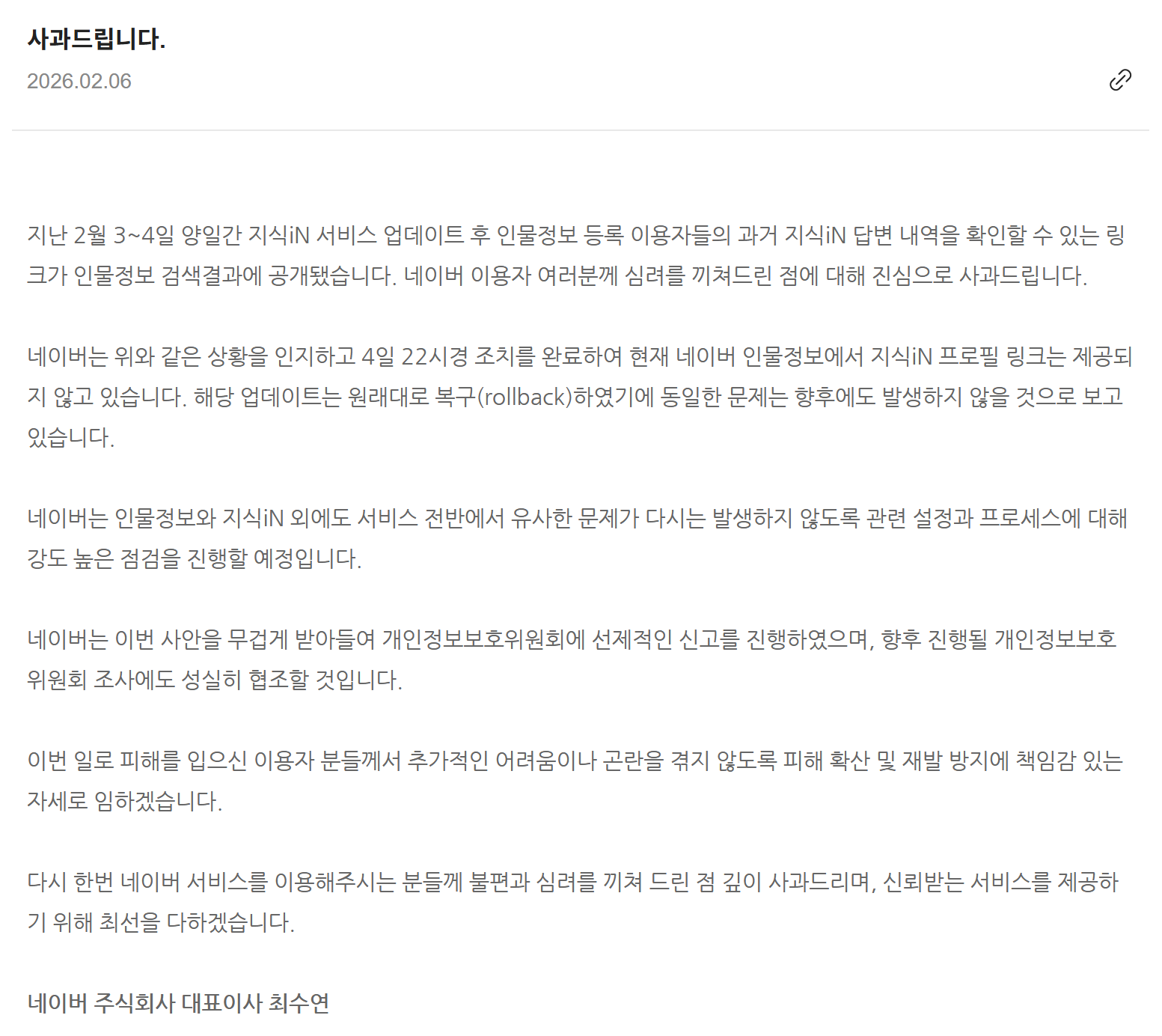 지난 2월 3~4일 양일간 지식iN 서비스 업데이트 후 인물정보 등록 이용자들의 과거 지식iN 답변 내역을 확인할 수 있는 링크가 인물정보 검색결과에 공개됐습니다. 네이버 이용자 여러분께 심려를 끼쳐드린 점에 대해 진심으로 사과드립니다.