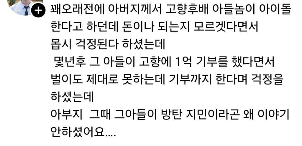 1억 기부한 고향 후배 아들놈 작성자가을날4|작성시간26.02.07|조회수32,811 목록 댓글 1 글자크기 작게가 글자크기 크게가 다음검색 현재 게시글 추가 기능 열기 북마크 공유하기 신고 센터로 신고 댓글 댓글 1 댓글쓰기 답글쓰기 댓글 리스트 작성자소소비2 | 작성시간 26.02.07 쓸데없는 걱정을 하셨네 댓글 전체보기