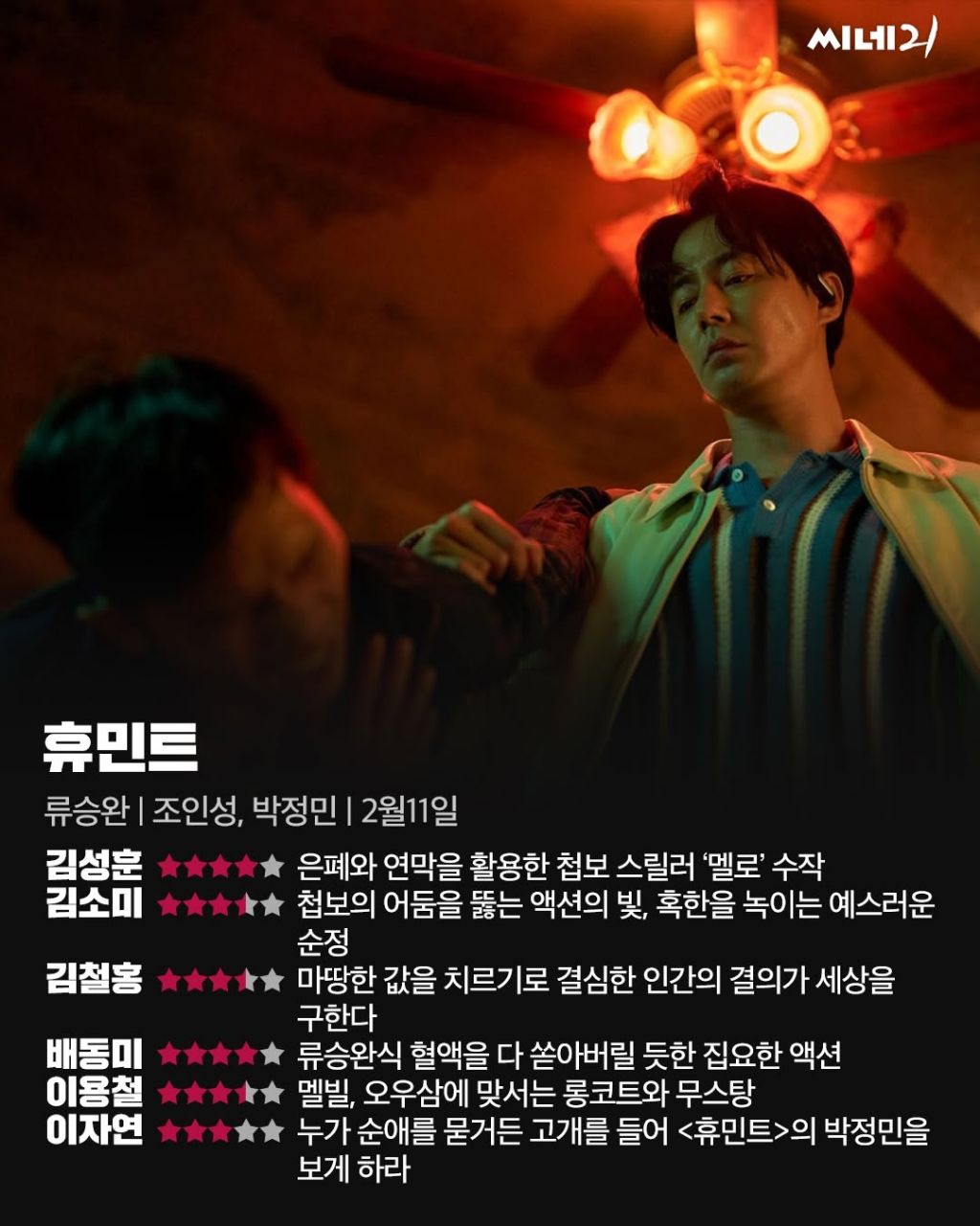 [영화]류승완 감독 <휴민트> 씨네21 별점.jpg 작성자gjfhdfad|작성시간26.02.07|조회수5,163 목록 댓글 3 글자크기 작게가 글자크기 크게가 류승완 감독조인성 박정민 신세경 박해준 출연2월 11일 수요일 개봉 다음검색 현재 게시글 추가 기능 열기 북마크 공유하기 신고 센터로 신고 댓글 댓글 3 댓글쓰기 답글쓰기 댓글 리스트 작성자아킬라 | 작성시간 26.02.07 오 나쁘지 않은가보네 작성자가을날4 | 작성시간 26.02.07 봐야지 작성자Dennis Cirkin | 작성시간 26.02.07 재미없을 수가 없지 베를린으로 이미 증명한 장르라 ㅋㅋ 댓글 전체보기