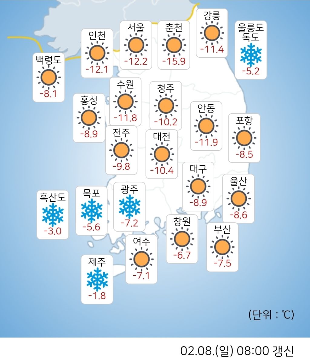 [정보]현재 기온 작성자치타|작성시간26.02.08|조회수6,919 목록 댓글 6 글자크기 작게가 글자크기 크게가 대관령 영하 18.3도 ㄷㄷ철원 영하 17.3도 ㄷㄷ부산 영하 7.5도 ㄷㄷ 다음검색 현재 게시글 추가 기능 열기 북마크 공유하기 신고 센터로 신고 댓글 댓글 6 댓글쓰기 답글쓰기 댓글 리스트 작성자모과차 | 작성시간 26.02.08 올 겨울의 진짜진짜 마지막 인사겠지..? 작성자Andrea Pirlo 21 | 작성시간 26.02.08 ㅠㅠ 작성자이나경 | 작성시간 26.02.08 헉 작성자JTBC | 작성시간 26.02.08 이건 아니잖아... 작성자PLANTALE | 작성시간 26.02.08 아침에 세차하다가 손 잃을뻔 댓글 전체보기