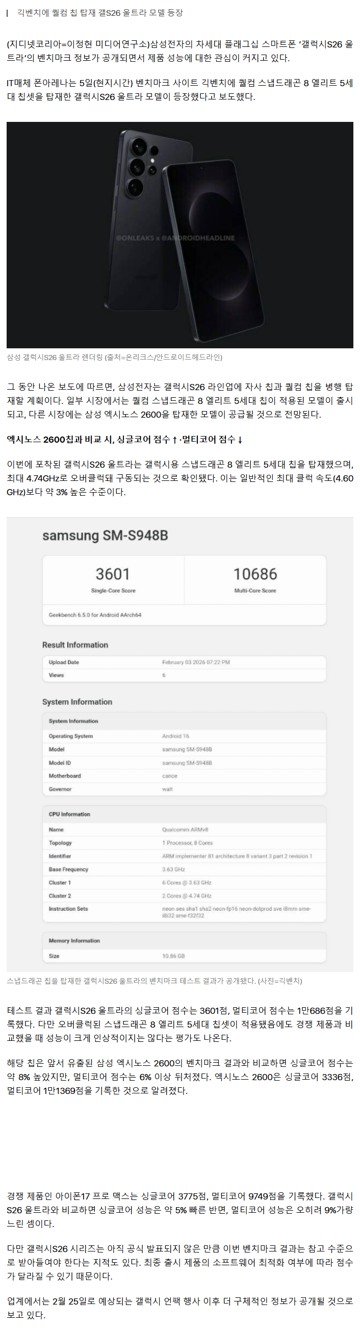 [기사]갤럭시S26 울트라 성능, 아이폰17 프로 맥스 능가하나? 작성자김바덕|작성시간26.02.08|조회수1,887 목록 댓글 2 글자크기 작게가 글자크기 크게가 https://v.daum.net/v/20260206111825286갤럭시S26 울트라 성능, 아이폰17 프로 맥스 능가하나(지디넷코리아=이정현 미디어연구소)삼성전자의 차세대 플래그십 스마트폰 ‘갤럭시S26 울트라’의 벤치마크 정보가 공개되면서 제품 성능에 대한 관심이 커지고 있다. IT매체 폰아레나는 5일(v.daum.net 다음검색 현재 게시글 추가 기능 열기 북마크 공유하기 신고 센터로 신고 댓글 댓글 2 댓글쓰기 답글쓰기 댓글 리스트 작성자페더스맥그로 | 작성시간 26.02.08 무조건 넘겨야지 작성자초록색포스트잇 | 작성시간 26.02.08 퀄컴도 애플보다 코어성능 못뽑가하네요 ㅡㅡ 댓글 전체보기