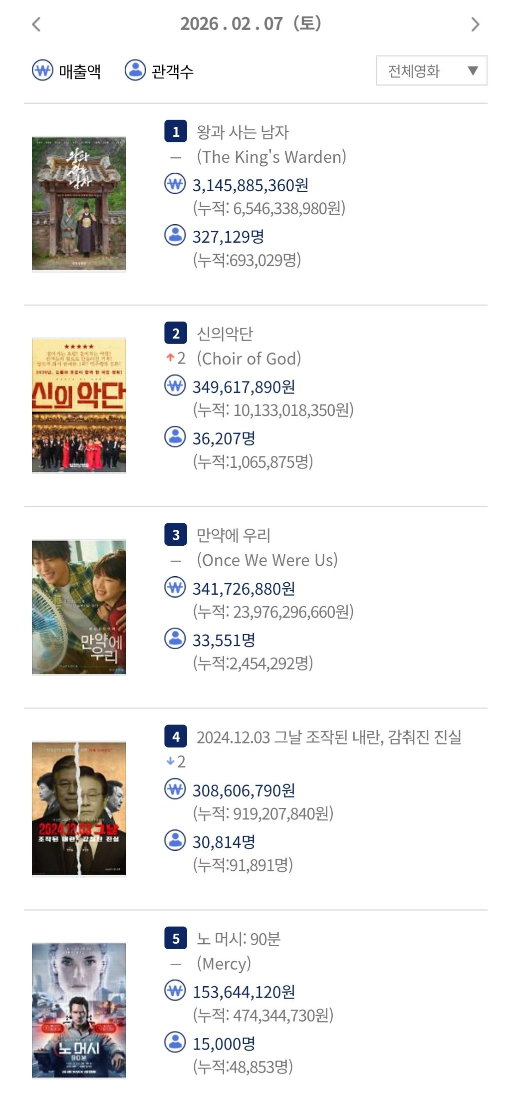 [정보]어제자 박스오피스 TOP 5 작성자Hailee Steinfeld|작성시간26.02.08|조회수6,001 목록 댓글 3 글자크기 작게가 글자크기 크게가 출처 KOBIS근데 4위 저건 뭐여.. 다음검색 현재 게시글 추가 기능 열기 북마크 공유하기 신고 센터로 신고 댓글 댓글 3 댓글쓰기 답글쓰기 댓글 리스트 작성자Jordan | 작성시간 26.02.08 설 앞두고있지만 완전 비수기네 작성자정예린 | 작성시간 26.02.08 박지훈 연기잘함 작성자수원BLUE윙즈 | 작성시간 26.02.08 한국 영화 잘 안보는데 만약에 우리 재밌었네요. 라라랜드 이후로 오랜만에 먹먹함을 주는 영화 였습니다. 댓글 전체보기
