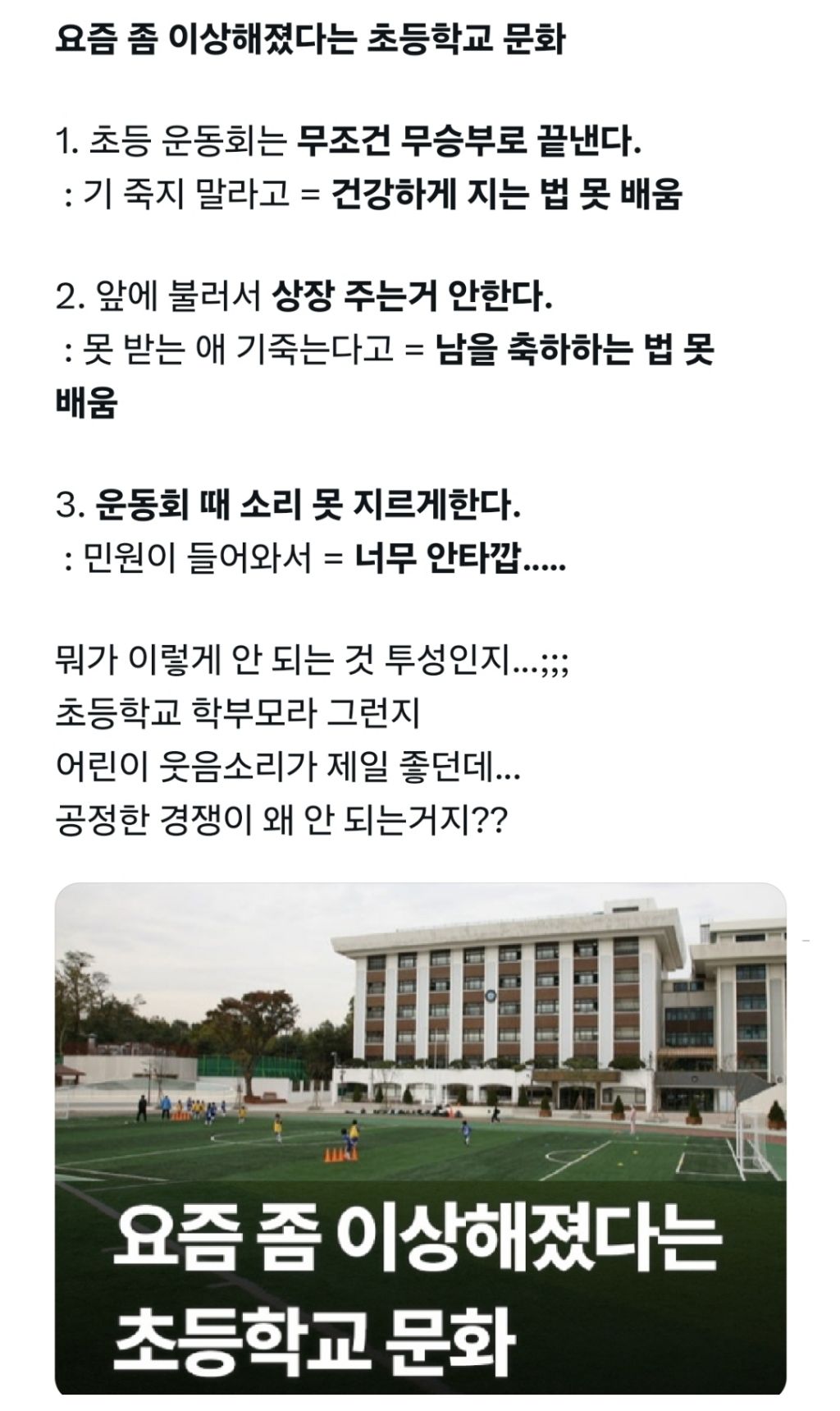 [유머]요즘 좀 이상해졌다는 초등학교 문화.jpg 작성자강동구주민 3|작성시간26.02.08|조회수8,306 목록 댓글 15 글자크기 작게가 글자크기 크게가 무승부 문화는 리얼 충격적이네 다음검색 현재 게시글 추가 기능 열기 북마크 공유하기 신고 센터로 신고 댓글 댓글 15 댓글쓰기 답글쓰기 댓글 리스트 작성자아이스핫초코 | 작성시간 26.02.08 개판이네 ㅋㅋ 작성자대전시티즌ID | 작성시간 26.02.08 우리 아이들 학교는 저런거 없음 작성자살살합시다 | 작성시간 26.02.08 비웅신들ㅋㅋㅋ 작성자KTBFFH | 작성시간 26.02.08 너무 어화둥둥 거린다 요즘은 결핍에 대해서 안 알려주니까 애들이 세상 지들껀지 알고 그렇게 이기적이지 작성자아메리카노 | 작성시간 26.02.08 헐 댓글 전체보기