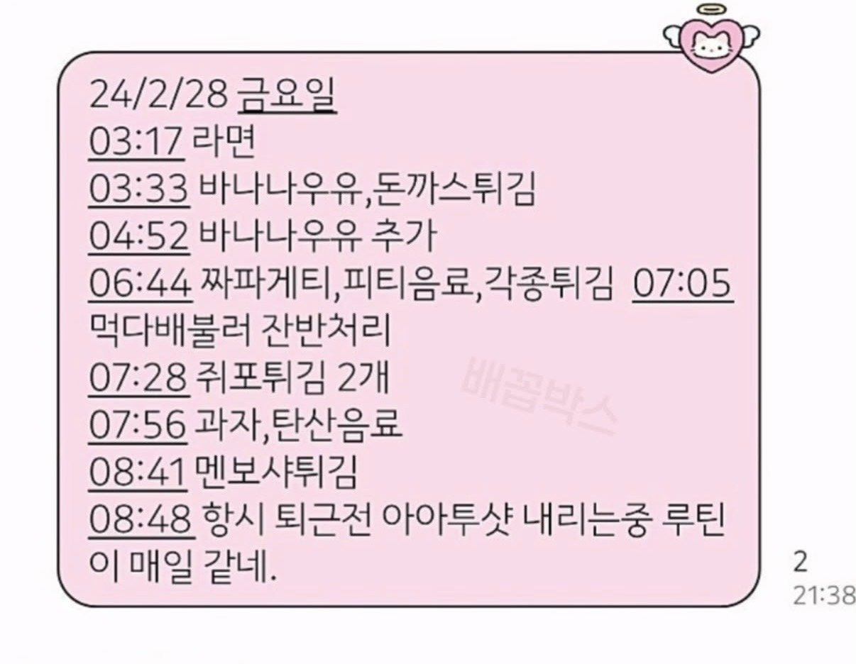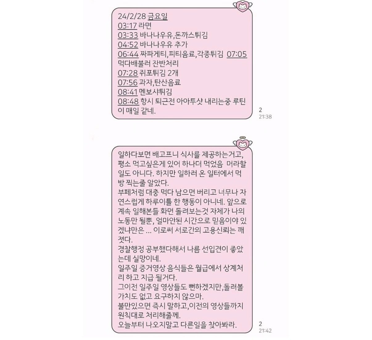 [기타]PC방 알바가 짤린 이유 작성자음교수|작성시간26.02.08|조회수4,533 목록 댓글 4 글자크기 작게가 글자크기 크게가 다음검색 현재 게시글 추가 기능 열기 북마크 공유하기 신고 센터로 신고 댓글 댓글 4 댓글쓰기 답글쓰기 댓글 리스트 작성자ㅈㅈ | 작성시간 26.02.08 많이도 처먹었네 작성자밀키스 | 작성시간 26.02.08 2006년인가 겜방알바할때 사장형이 맘대로 꺼내먹으라해서 커피 핫바같은거 막 먹엇는데ㅋㅋ 재고파악같은것두 안하고 월급날되면 금고에서 바로꺼내서 줫엇음 작성자조손 | 작성시간 26.02.08 무슨 쉴새없이 먹네 작성자Jesse Lingard | 작성시간 26.02.08 아오... 댓글 전체보기