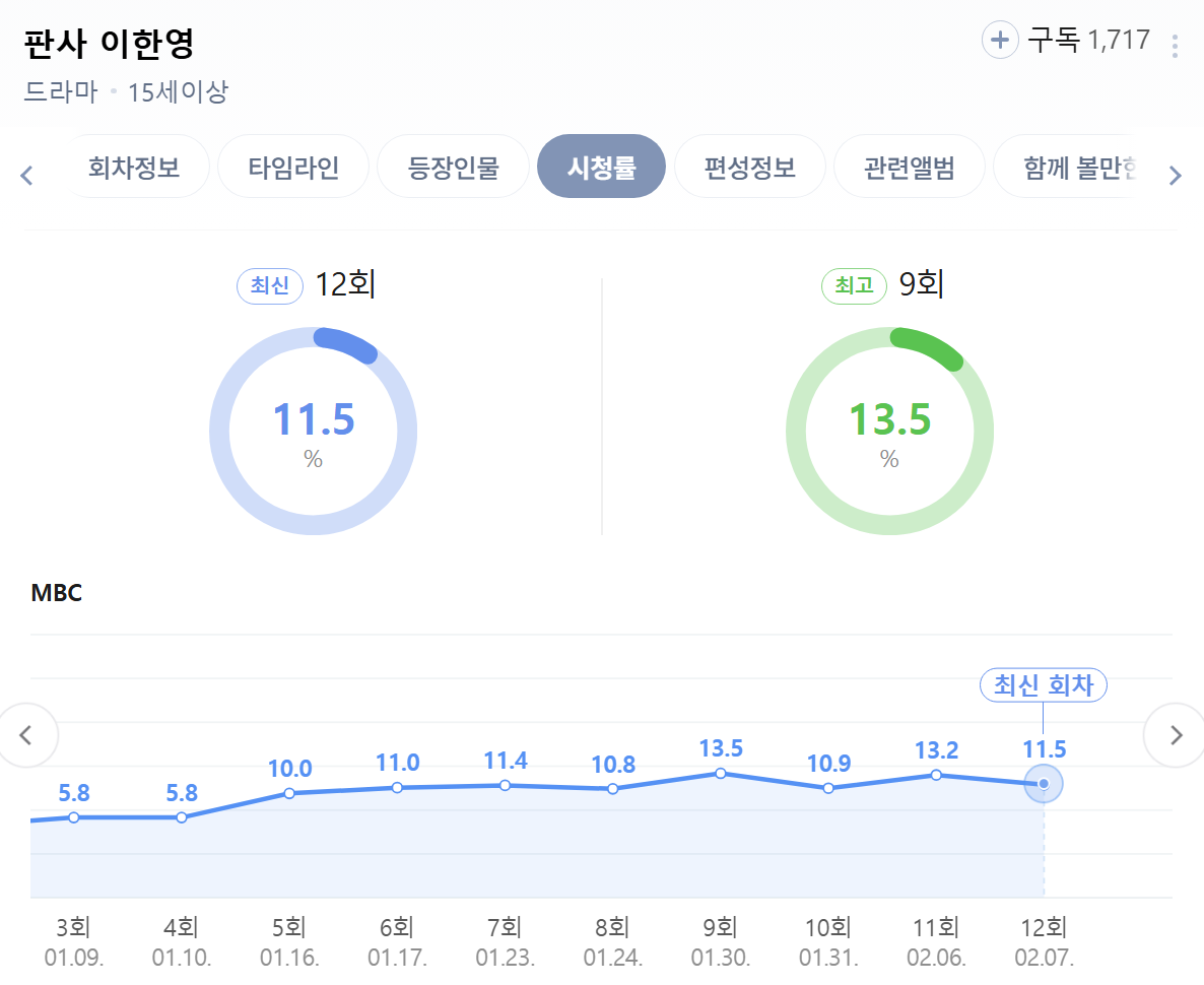 [방송]다음주 종영하는 MBC '판사 이한영' 시청률 추이 작성자서스날|작성시간26.02.08|조회수4,292 목록 댓글 7 글자크기 작게가 글자크기 크게가 12회 11.5%, 최고 15.9%다음주 13, 14회(최종), 13회는 9시 40분부터 10분 확대편성 다음검색 현재 게시글 추가 기능 열기 북마크 공유하기 신고 센터로 신고 댓글 댓글 7 댓글쓰기 답글쓰기 댓글 리스트 답댓글 작성자아메리카노 | 작성시간 26.02.08 저도요 ㅋㅋㅋㅋㅋㅋㅋ 작성자정예린 | 작성시간 26.02.08 존잼 ㅎㅎ 김병기배우님 ㅋㅋㅋㅋ 작성자그로구 | 작성시간 26.02.08 아 너무 재밋엉!!! 작성자ALCOHOLLICA | 작성시간 26.02.08 어게인 마이 라이프랑 비슷하네 생각했는데 작가가 같음.... 답댓글 작성자HYNN박혜원 | 작성시간 26.02.08 헐 ㅋ어쩐지 댓글 전체보기