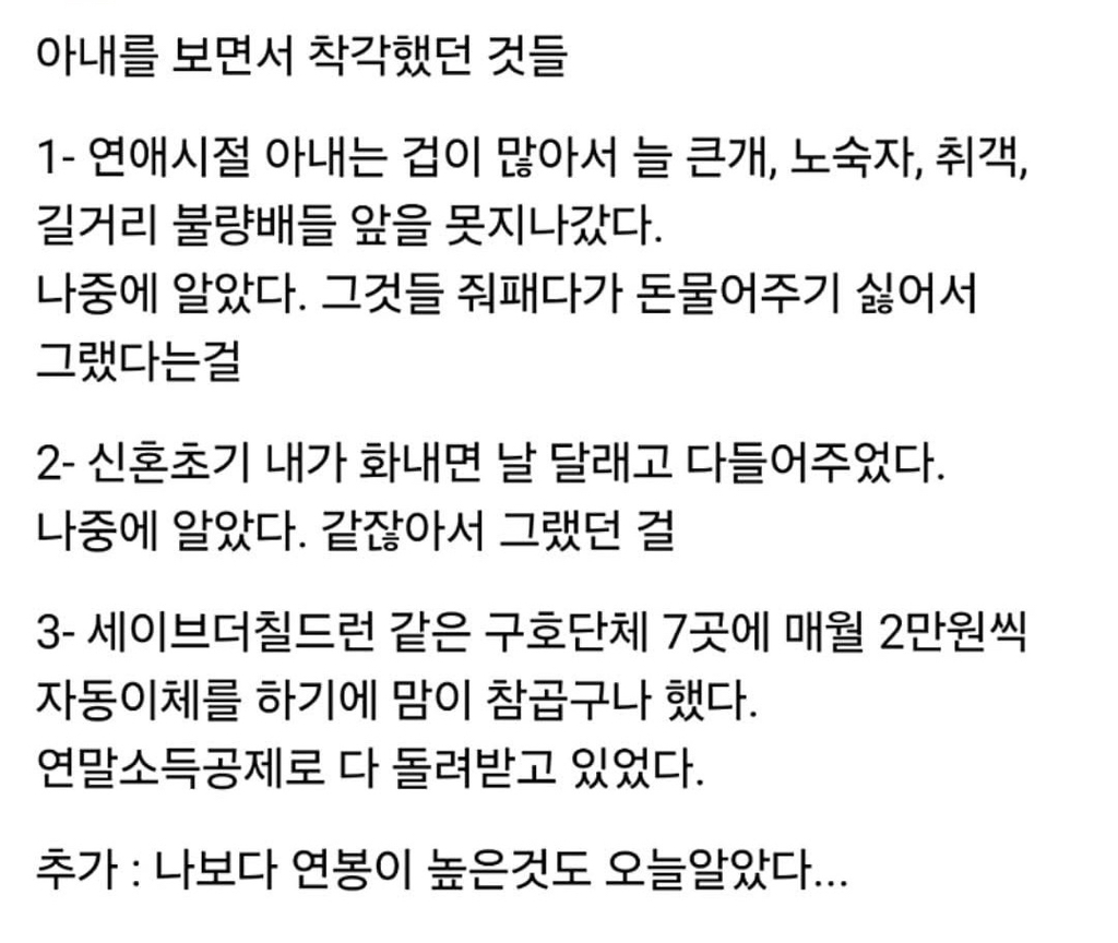 아내를 보면서 착각했던 것들 작성자가을날4|작성시간26.02.10|조회수3,883 목록 댓글 1 글자크기 작게가 글자크기 크게가 다음검색 현재 게시글 추가 기능 열기 북마크 공유하기 신고 센터로 신고 댓글 댓글 1 댓글쓰기 답글쓰기 댓글 리스트 작성자마이너스템포 | 작성시간 26.02.10 잘모시고살아야지 댓글 전체보기
